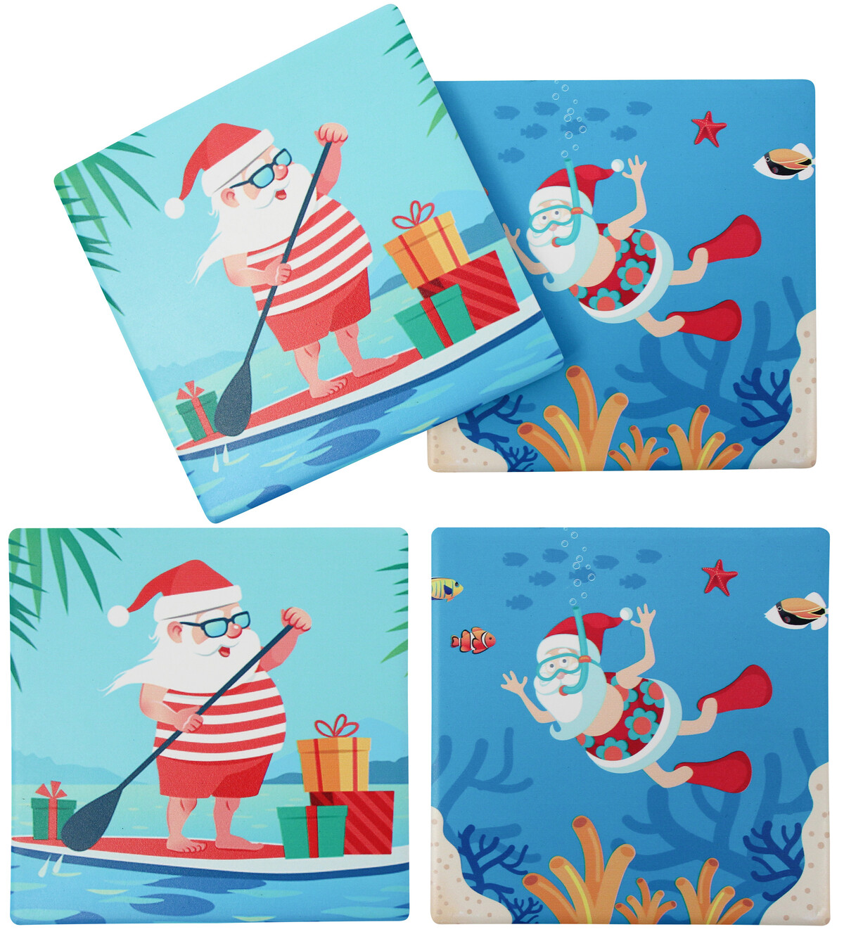 The Coasters Summertime Santa S/4 is a lovely collection of four gorgeous coasters which are available for sale at customer friendly pricing. With all four coasters made in a square shaped design which measures 10 centimetres in length and height using premium quality dolomite and cork materials, each set consist of two similarly designed coasters. The first two coasters showcases Santa dressed for the beach and paddling his canoe with a few gift boxes he intends to deliver to Australian coastal region. The second coaster showcases him having a great time as he dives deep beneath the sea.