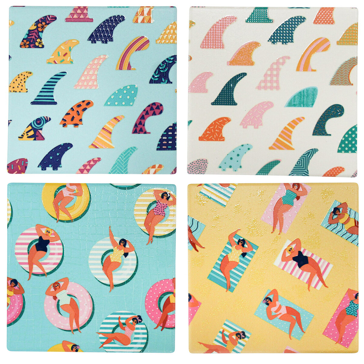Featuring soft pastel backgrounds matched against alluring tones of yellow, orange, and blue that paint a harmoniously relaxing ambiance. This motif is sure to evoke a serene and coastal feel. These coasters are perfect for a modern take on the nautical theme. This sweet design will add a refreshing vibe to your interior in a fun and inviting way. What's more, another pair of these coasters highlights repeat surfing board illustrations in colourful shades and patterns that resonate with contemporary trends. Instantly elevate your mood and transport yourself to paradise with our spectacular seaside-themed coasters.