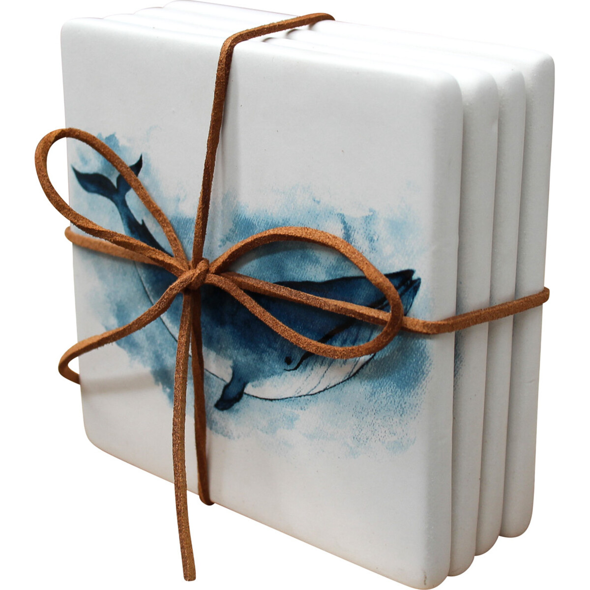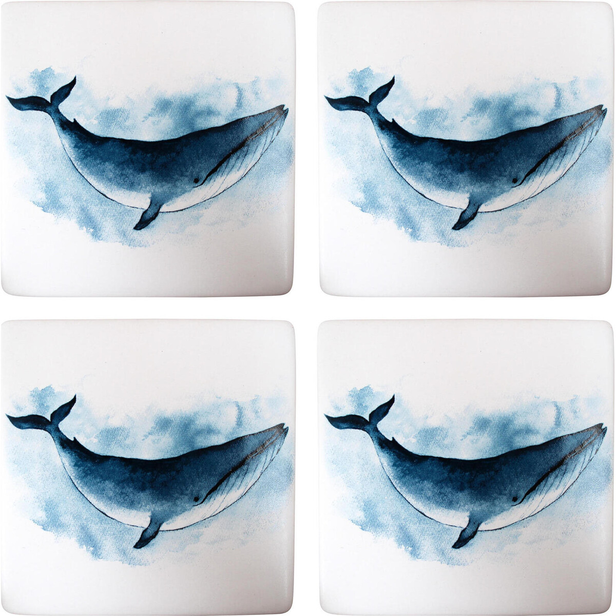 Drink in style with this lovely set of coasters that are made from a durable ceramic material to endure daily use with a quality print that protects the artwork for a long time so there is no worry about the drink sweating and ruining the art. The simple yet striking whale motif in the centre of each coaster has a nice watercolour effect. This set will keep tables and counters unharmed and is ideal as a gift as a wedding or shower, birthdays or just around the house. Please note this product is individually handcrafted therefore some minor variations in colour and image may occur.