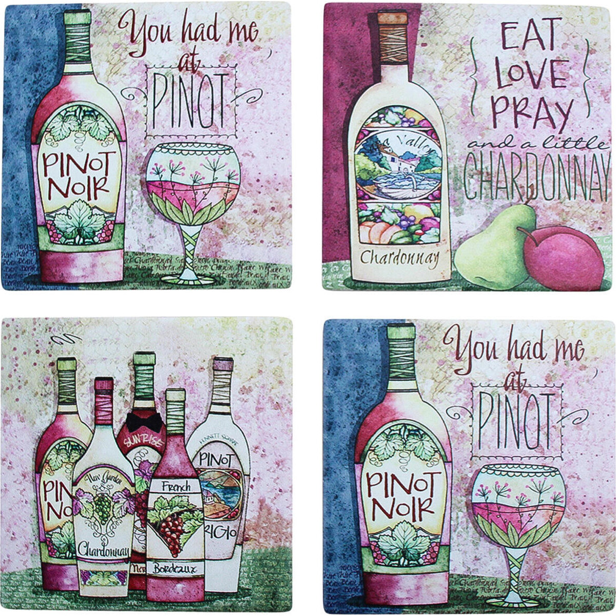 Give your table tops the advantage of staying stain free and clean with this set of four coasters crafted from ceramic and given a cork base. The top has been given this gorgeous wine themed print with a delicate retro style pencil sketch being the art form. The usage of soft colour palette lends it that pretty elegant kind of presence that will bend in well with all spaces. simple wipe with a damp cloth will ensure that the coasters remain looking sparkling clean. While some feature wine bottles, the others feature wine goblets. Such a wonderful means to introduce a lovely relaxed appeal to tablet tops while ensuring that you keep them from safe from water rings and other hot singes. The set has four coasters each of them in a square shape with 10 cm dimension.