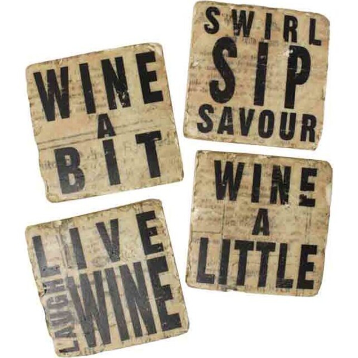 The Coasters - Wine Sip is a stylish wall décor that is perfect for wine lovers and wine connoisseurs. It consists of four separate pieces that each feature a message that talks about 'wine drinking'. Also, the wordings of the messages are somewhat comical and whimsical.