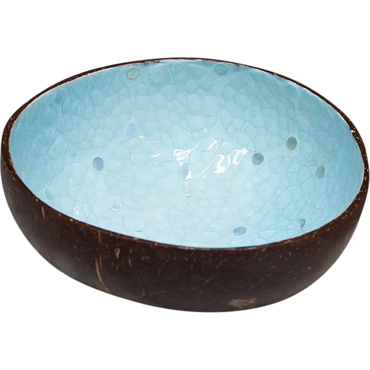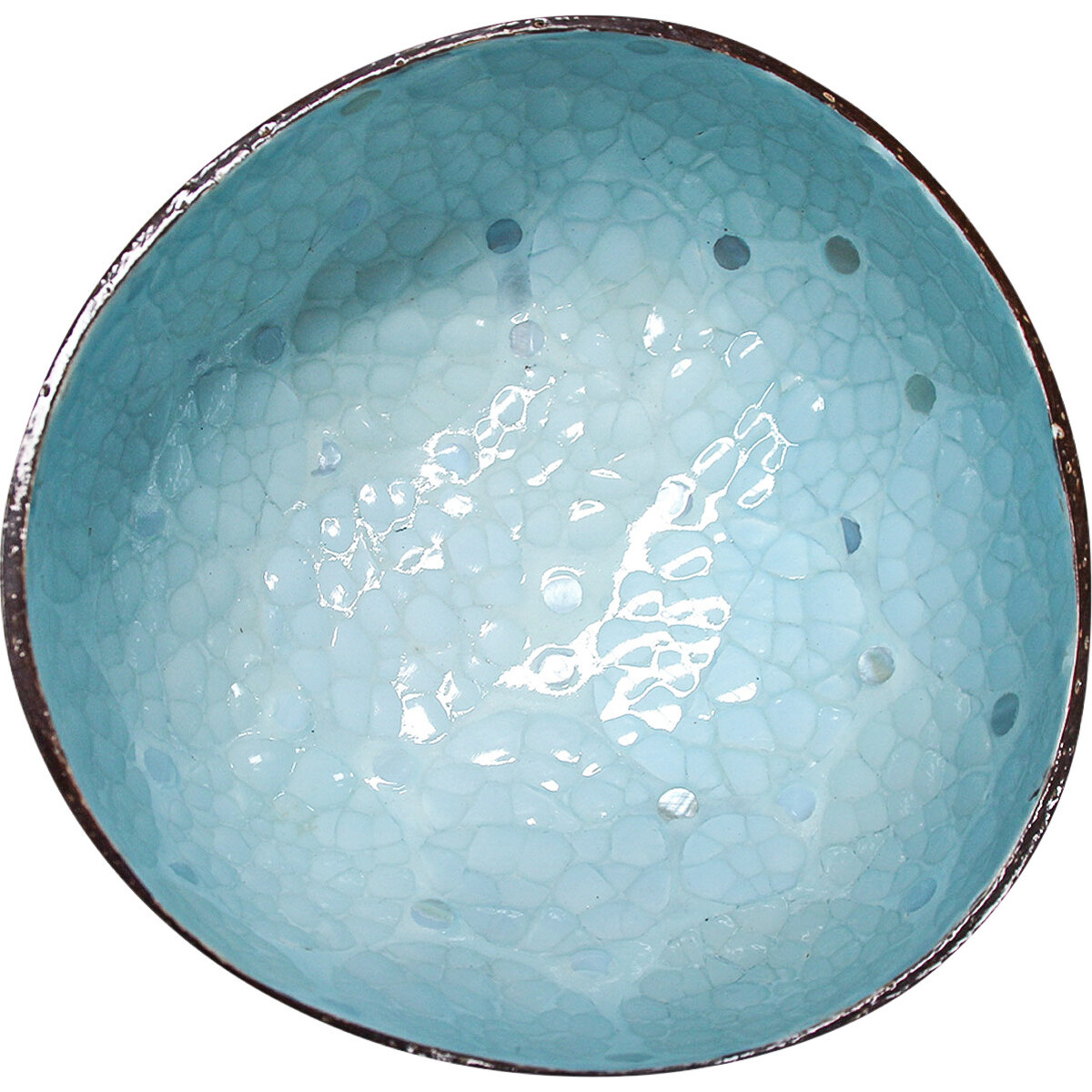 The diameter is 13 cm and its soft blue colour delightfully combines with the brown in the outer shell. The bowl is about 6 cm deep which makes it great pick as displayable artefact - perhaps to merely place on the console where you could keep your keys or loose change - or perhaps as any other serving bowl for dry snacks. The artisanal quality bowl has bene handcrafted from a coconut shell - the outer cover of which is deep brown in colour while the inner curvature ahs been lined with tiny egg shell particles glued and varnished to a spectacular neat finish. The combination is unique and unbelievable in its smooth and classy finish, it would function like a trinket tray or a dry snack server s well. Add this to any space - especially wishing to show off s marine or coastal hues as it blends in organically with that look.