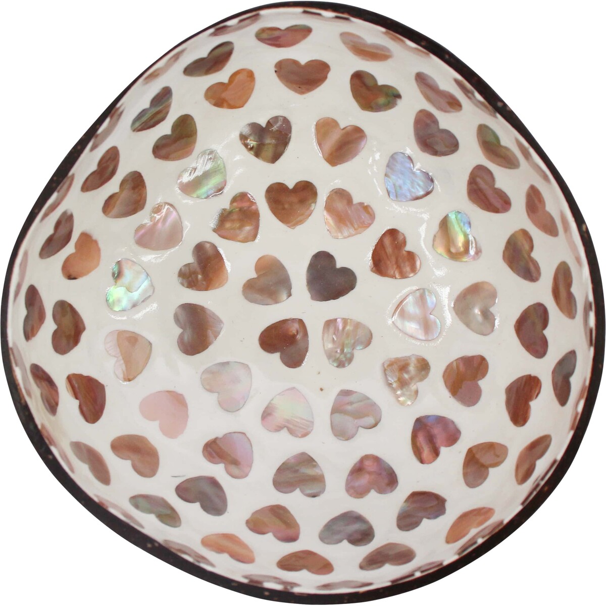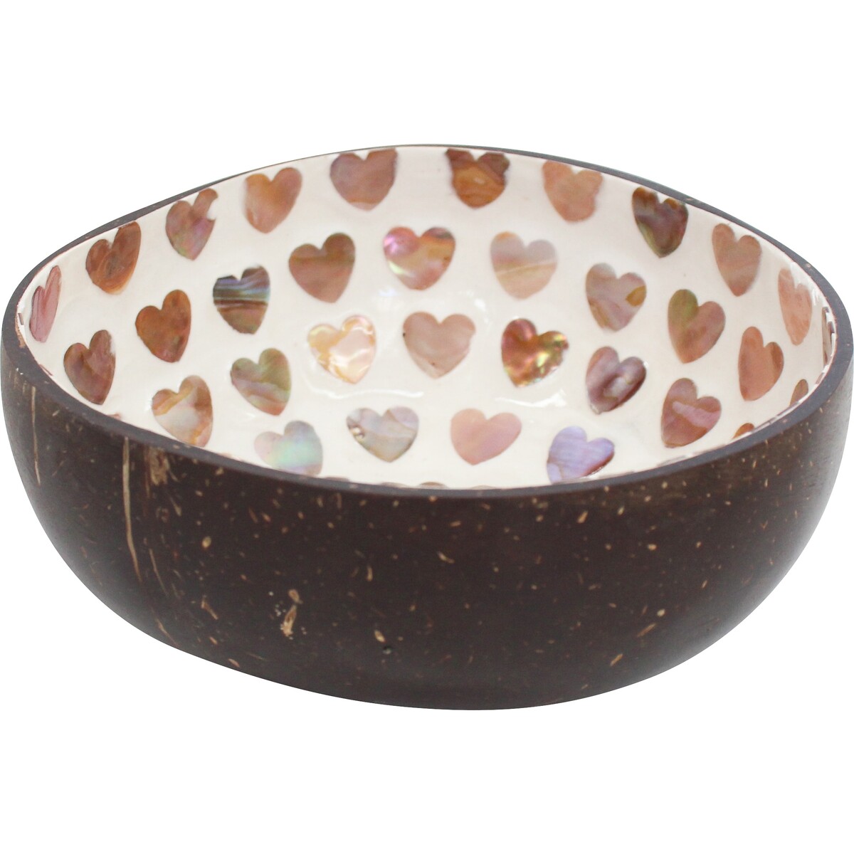 Coconut Bowl Hearts has a unique and irregular circle shape. The beautiful hearts glow and dazzle brilliantly to create an exquisite piece. Offering elegance to a dining table, this piece is designed to stand out.