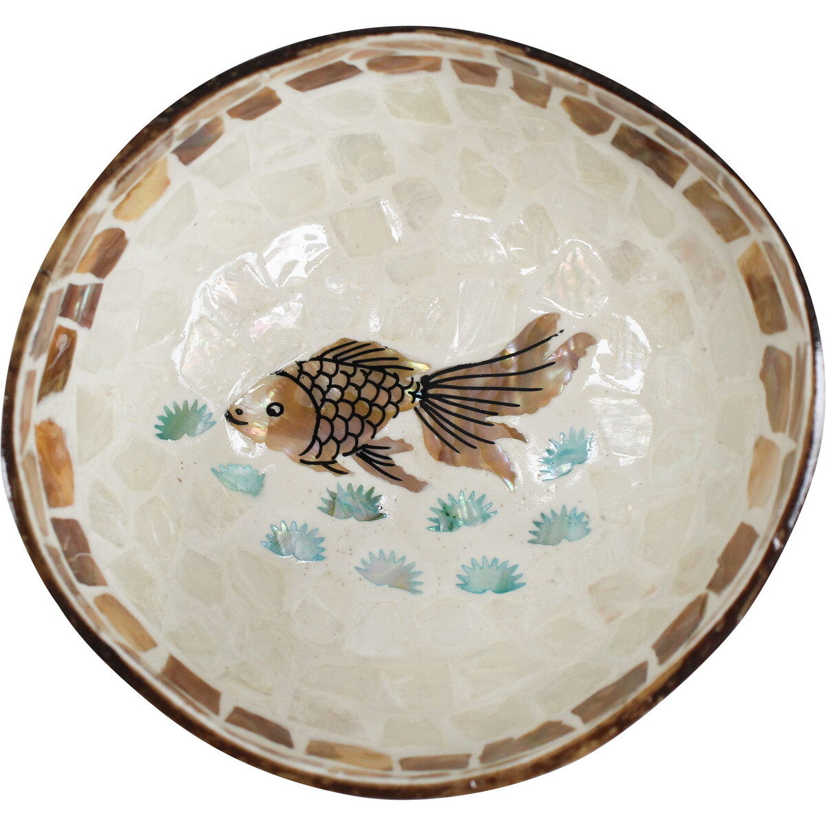 Coconut Bowl Marine Natural draws inspiration from the rustic charm. This bowl has a stunning brown exterior with a creative interior in a white hue. The fish in the ocean motif gives it a touch of difference. What's more, the irregular square shapes at the edge complete the look. It's a chic, stylish yet functional piece. It has been refined into a modern style that fits as an exquisite centrepiece. Coconut Bowl Marine Natural is created to enjoy healthy eating while connecting with nature. It appeals to the aesthetic preference of both young and old which makes it a versatile piece.