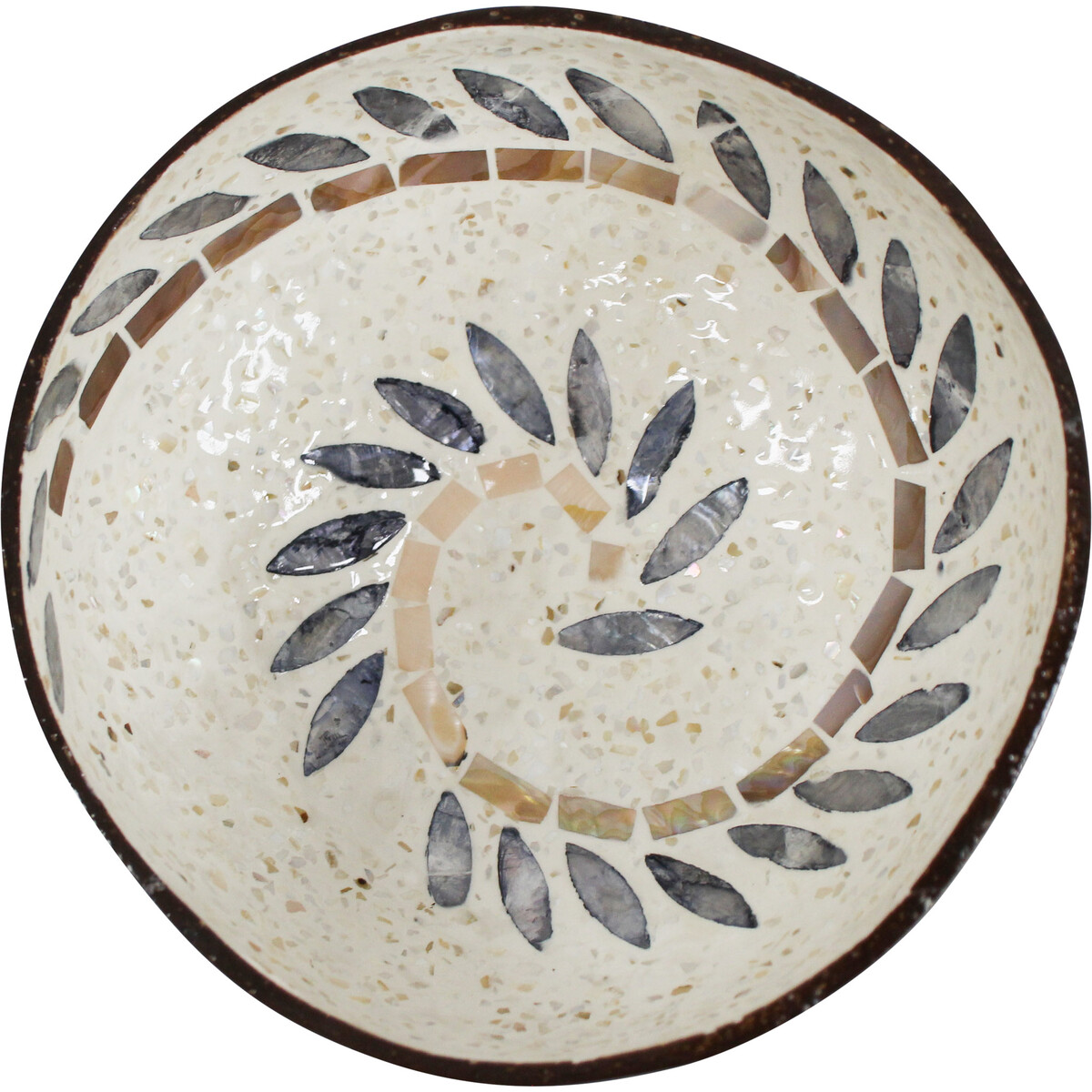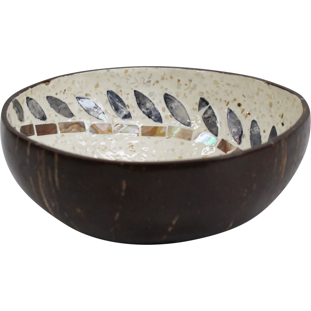 The brown of the natural coconut shell forms the base of this bowl. The capiz set inside has been handset in a simple pattern that instantly catches your attention with its pearlescent look. The coconut shell has been smoothened not just from the inside but also from the outside to make it appear almost like polished wood. Proving its versatile usage once again, the coconut shows off its woody colour as well as is paved gorgeously with a delicate pattern in pearly white capiz to bring the contrast of material and colours to the fore. About 13 cm in diameter, the bowl is about 6 cm in depth and sits well balanced on its round base that holds its balance. It’s lightweight and can be easily cleaned with a damp cloth to bring back its pearly sheen.