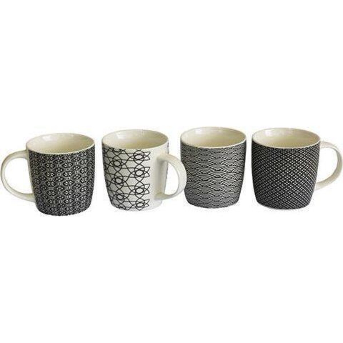 Add a dash of elegance and good looks to your coffee table moments when you serve in the four mug set that is made with very fine quality ceramic given a perfect finish on its exterior and the right design to get some serious conversation started. The mug is just the right size wt the diameter the kind that will be easy to sip from. The curved handle is easy to grip and this mug will balance well in ones hand. Add this to your serve ware collection and each time you want to make your coffee time special, take this out , especially when you have over your very special bunch of friends. The mugs blend in perfectly with nay elegant setting with their black and white design. The interior of the cup is in white as is the handle that contrasts with the vivid design. The mugs are all of 9 cm high and the same in its diameter. The clean lines, smooth glaze and the perfect symmetry of print will be loved by you. Gift it at housewarmings or to someone whose love for coffee is known to you..