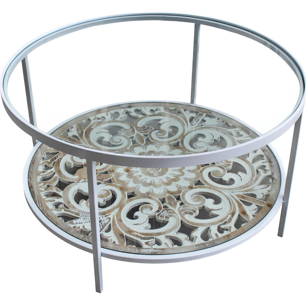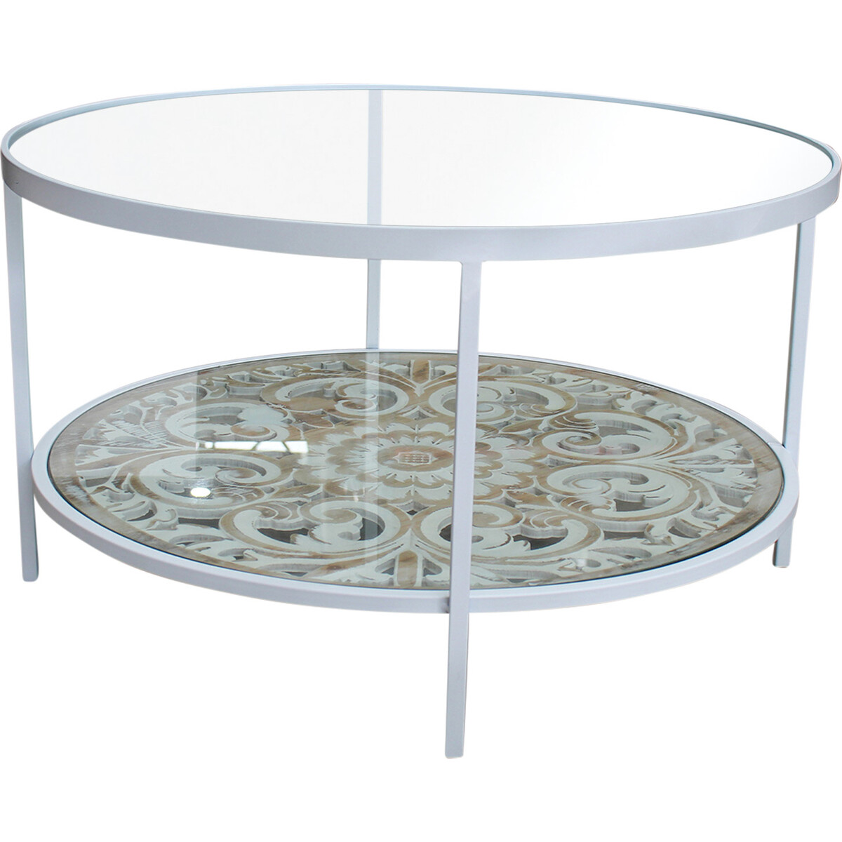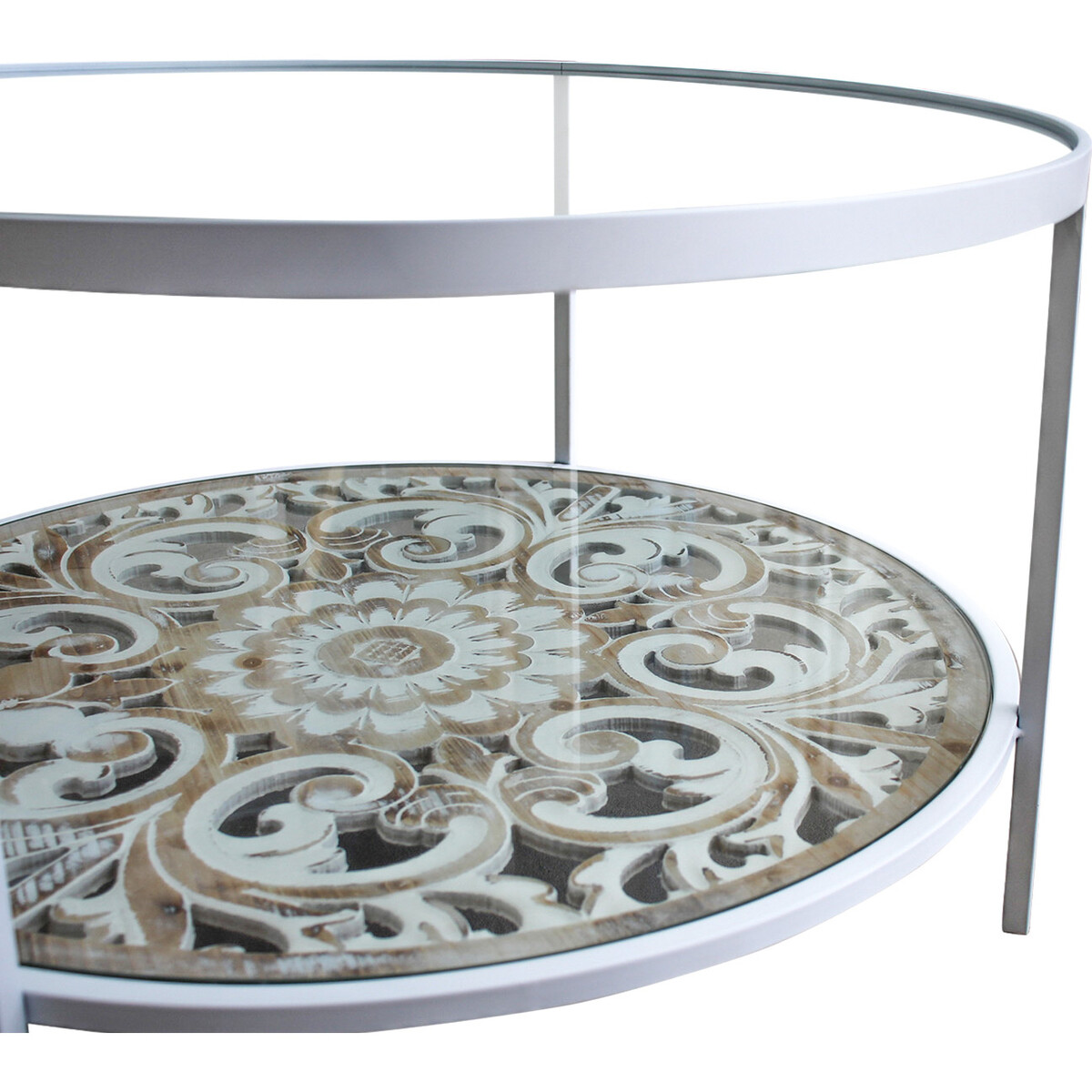 Give your seating area the much needed spirt pf style with this delightful touch of modern design with a touch pf vintage glamour that can be seen on the base of this table. The top is round with a clear glass that allows one to look at the pattern created on the base shelf. The shape as well as the proportion of this table makes to a perfect addition to all those space d that you wish to relax in - perhaps right in front of the couch - or in that exclusive use den where you like to retire to when the going gets too hectic and you need your book and a mug of coffee to calm your senses. Refresh your spaces with the touch of design done the perfect way for creating the right kind of ambience. The metal made frame with the simple four legs that are rustic straight and unembellished strikes a contrast to the ornate pattern at the base. A true touch of delight in your interiors.