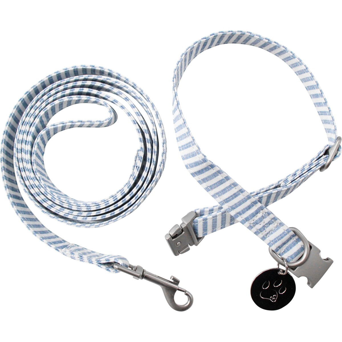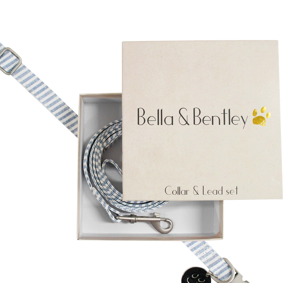 The timeless Hamptons-inspired pattern features a serene palette that effortlessly blends into various home and office decor schemes, adding a touch of elegance and sophistication. Whether draped over a coat rack, hanging by the door, or placed neatly in a storage basket, this collar and lead set not only serves a functional role for pet owners but also doubles as captivating decor.