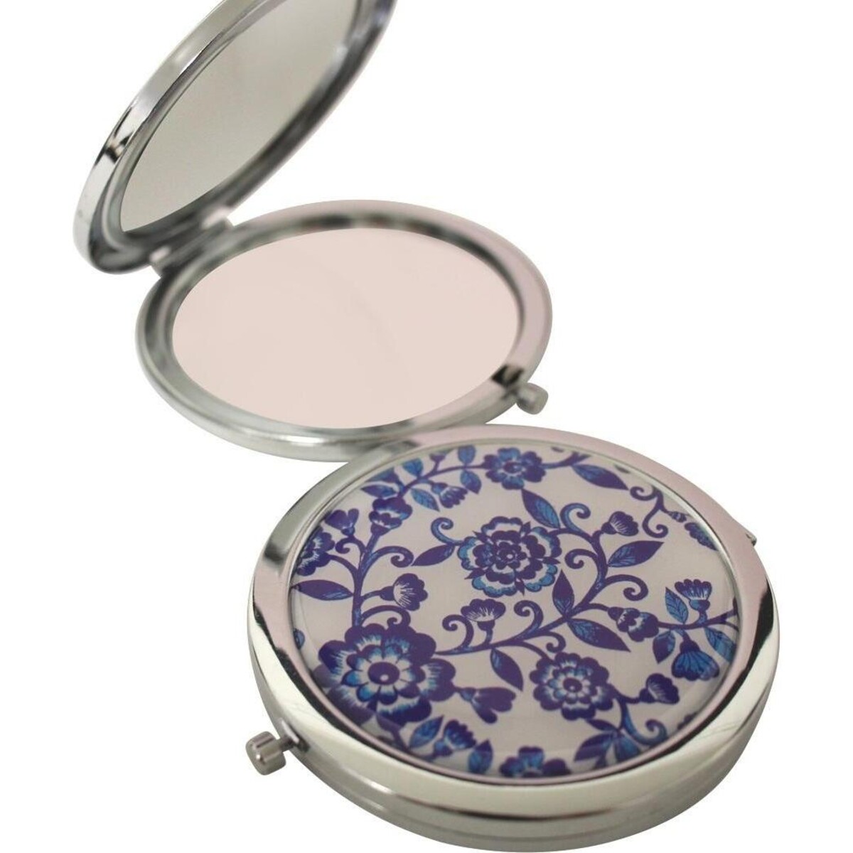 A compact is a girl's best friend when your work or travel takes you through another day of rushing around, yet your desire to look great all through can only be achieved if you have an accomplice that helps you out always. Here is an accessory that has two mirrors to help check your image in the minutest of details and the other that shows you the normal real image. The gold time lends the metal body a touch of vintage charm while the floral design makes the appearance all the more glamorous and just right for your touch up moments. So be it your lip stain, the wisps of hair out of place or the shiny nose - you so never wish to see - this compact will help make sure that you never face such a moment. Opens with a simple click; its blue chinaware like pattern adds a touch of old world vintage charm to its look. Superb size is what makes it so desirable for your evening bag or the day purse alike.