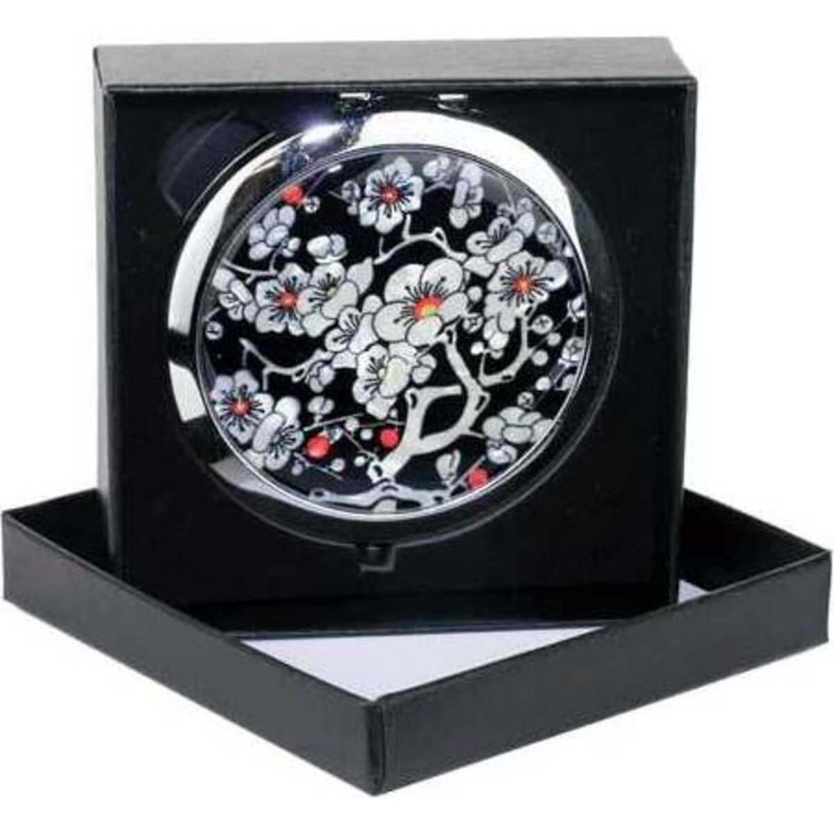 The cherry blossom designed compact comes with a dramatic black and white colour combination ?distinct and very charming ?this is one accessory that shall soon be a permanent resident of one's purse because of its great looks and the fact that it truly helps in making one look good as well. The 7 cm diameter is enclosed with shiny metal trim that looks ravishing with the black and white combination and the red cherries. The cherry blossom tree and its gnarled branches makes for a great graphic. Tiny but filled with special features like superb lock and opening mechanism, superior high grade mirror and tarnish resistant metal body-all of this makes this an accessory not to be missed by ladies who care that they look good and above all look great while making sure that they are looking good!!