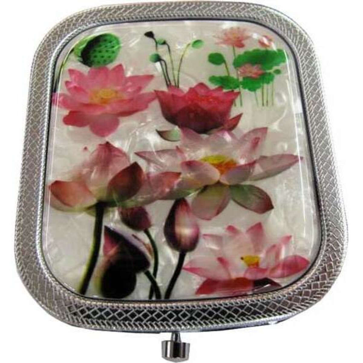 • The compact takes on a rectangular shape with beautifully rounded corners and a gleaming silver tone finish. • A lattice work design is etched into the wide border, and a bead trim detail is added to the inner edge fo the frame. • The cover design is durable acrylic with a Mother of Pearl-like finish, and is inset with a raised pillow style edge. • Several lotus blossoms, buds, and fronds appear in shades of pink, red, and green. • The mirror is found under the lid, and a spring action button opening with a snap close make it easy to use.