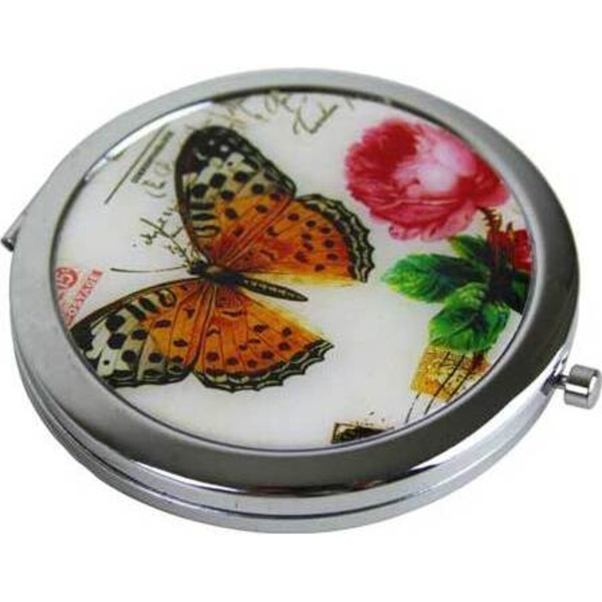 LaVida's Compact Mirror Orange Butterfly adds a spring garden image to a personal accessory. The lid of this shiny silver compact showcases a single orange and black butterfly with a single pink rose. The postcard - inspired design also features script handwriting and time stamps. This stylish compact is both pretty and practical.