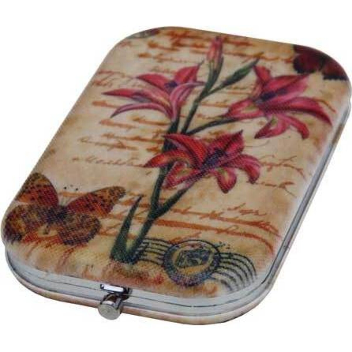 • Our exquisite Script Lilies Compact Mirror fits all the requirements of a collectible. • The smooth rectangular silhouette has a flat profile with rounded edges. • Quick release snap closure and a hinged lid make it easy to use. • Silver tone case has a gleaming mirror like finish. • The image includes a stem of coral day lilies and multicoloured butterflies set against a burnished cream background. • Red script text is imposed over the ground and a stamped postmark in one corner gives the feeling of a postcard from another era. This one has a truly vintage feel about it and will entice your customers to pick it up as a gift or to add to their own accessory collection.