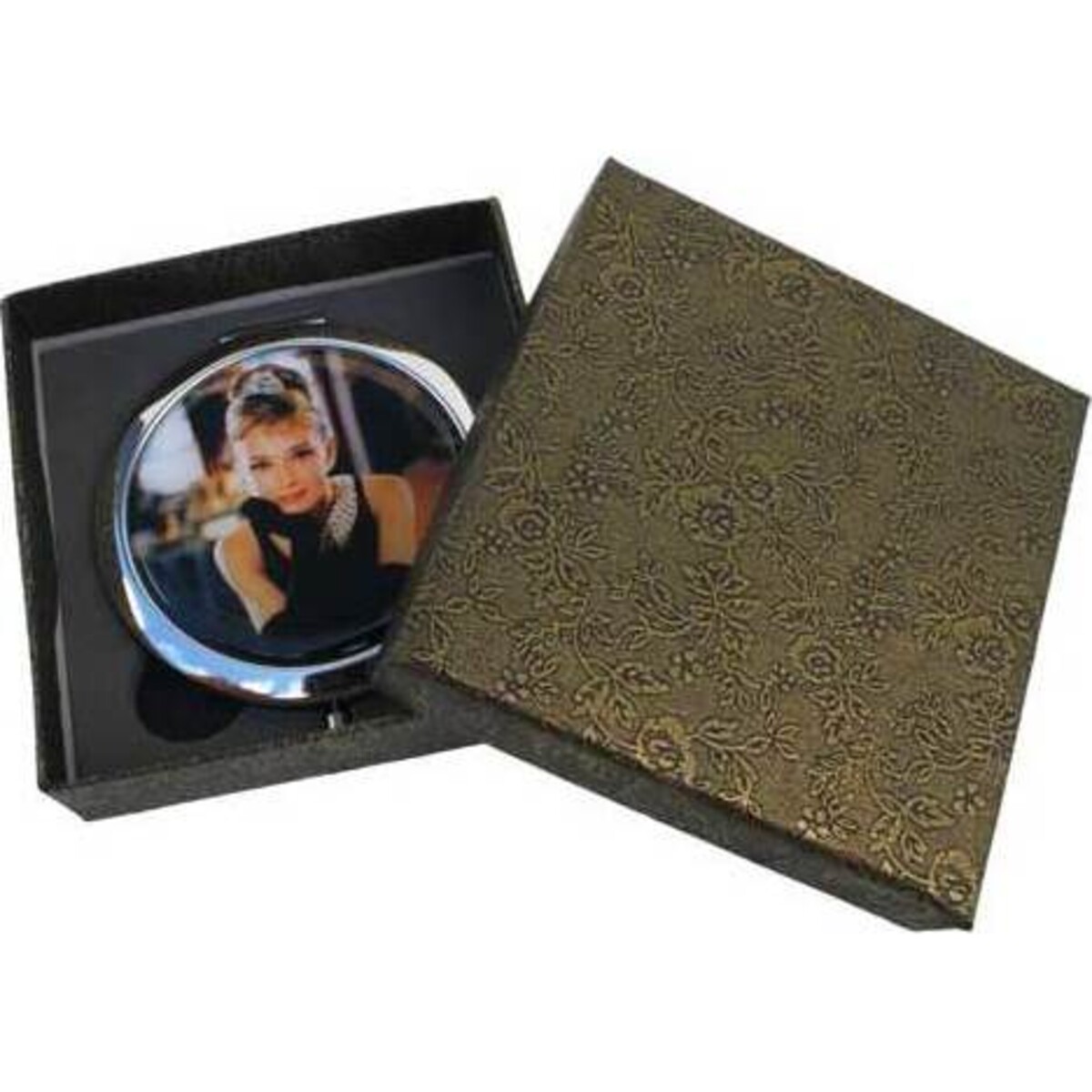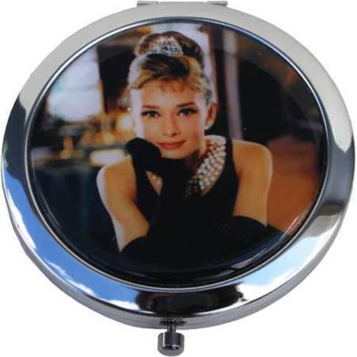 The picture of Audrey that adorns our Tiffany Audrey Compact Mirror is a representation of her role in the film "Breakfast at Tiffany's", in which she played the coquettish gamine Holly Golightly, making the "little black dress" hers forever. • The compact is a gleaming silver tone with a hinged back and a snaptight closure. • Mirrored inside lid and shallow well keeps makeup blotter, or it can simply be used for its mirror. Round out your inventory with this piece. Customers often pick up items like this one as last minute purchases for themselves or as gifts, so placing it near the register is a good way to increase sales. It can beef up your gift, cosmetics, accessories, and notions departments along with other items from our Audrey collection.
