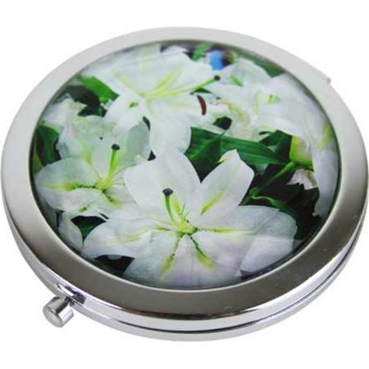 White lilies in bloom cover the lid of the Compact Mirror White Lily from LaVida. These stately flowers add simple elegance to the already simple design of the glossy silver compact. Each of LaVida's compact mirror designs allow for personal flair to show through the selection of a personal accessory.