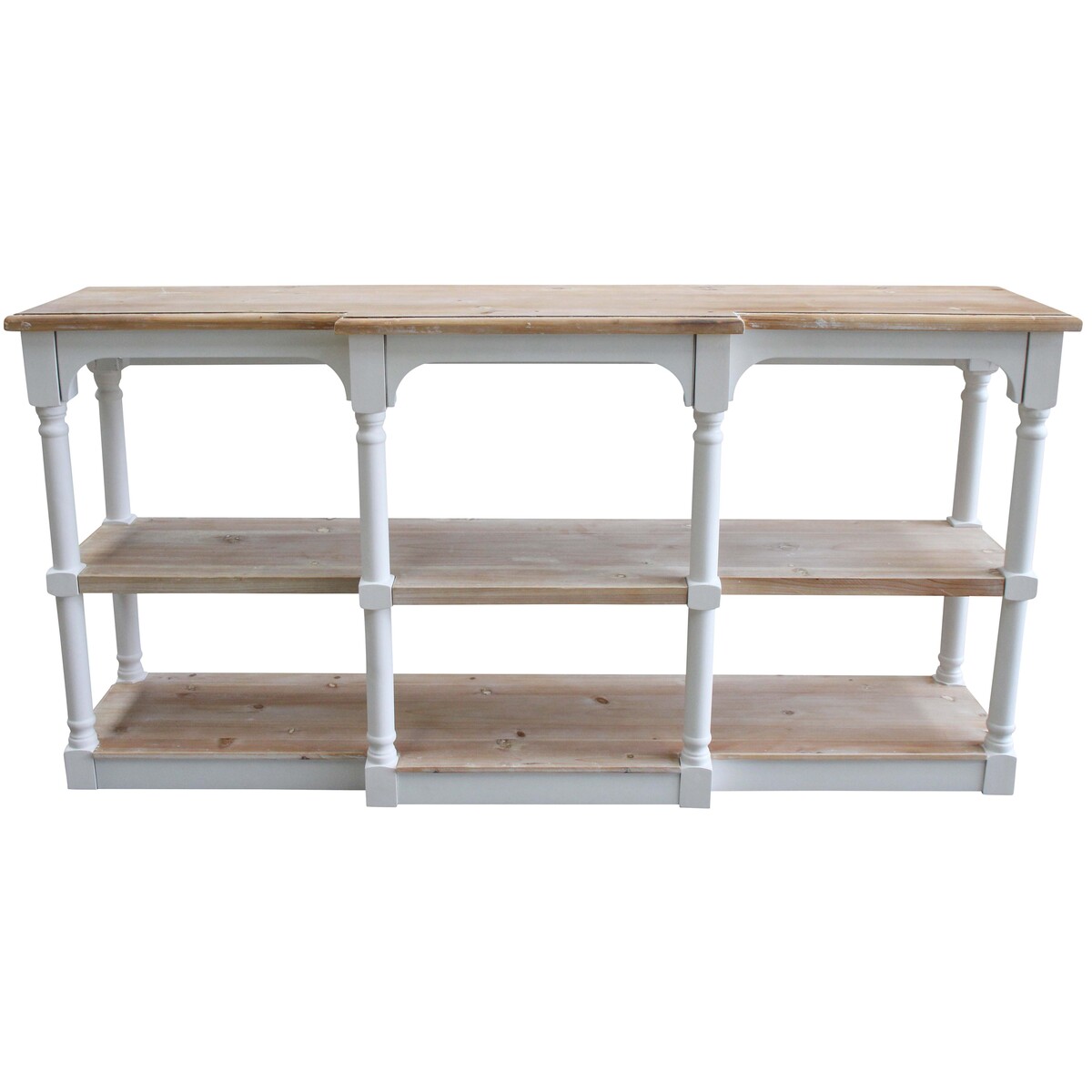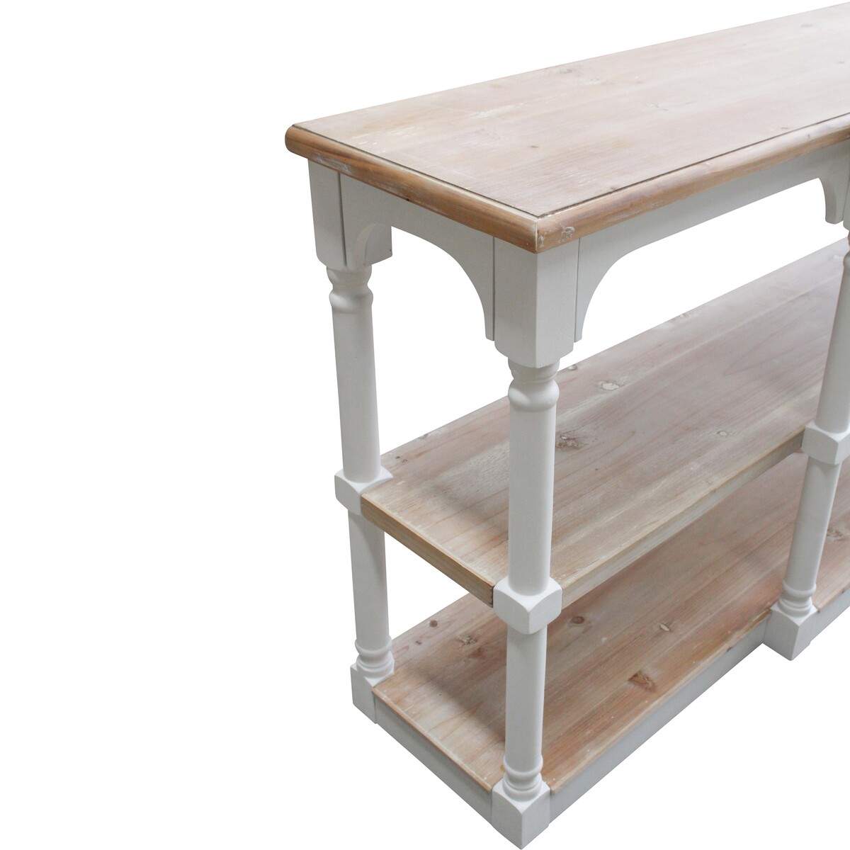 The off white colour-rubbed off paint in several places, the touch of vintage glamour all over its look and the minimalistic style -all of these features adds to the desirability of this console. Place a lamp, a collection of your favourite books and a delightful accessed to complete its look. The vintage white colour complements all kinds of decor-giving you so much space to place pictures, flowers and your favourite collection of knick knacks. Use it like a living room console or one that could be used in the kitchen as it gives you space for baskets and storage. The shabby washed in white wood with its knots and natural imperfections adds to its beauty.