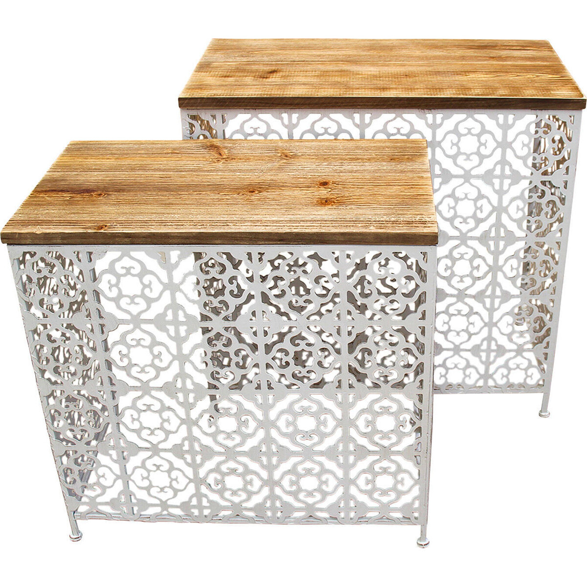 The white filigreed base is what makes quite a vivid statement. This set of tables are a great choice for your home if the interiors boasts of a wide and long corridor or if you wish to align all passage ways with the similar kind of console to fill up lonely corridor spaces. a perfect size in terms of how it will fit into the very wide corridor-it's got a beautiful pattern worked on metal that lends it a lovely uplifting design. The white further adds to its charm, which also combines beautifully with the woody look of the top. Place lamps candles, curios, sculptures on them or use them like you wold as an additional table by the side board topping it with crockery and cutlery-the choice is yours. The stunning design on it is surely going to soon be the highlight of the space and all you need to do is perhaps place a Moroccan lamp or votive and add to the undeniable charm of the set of two tables. A fabulous find for all who are looking to give their entryways and passages a substantial facelift.