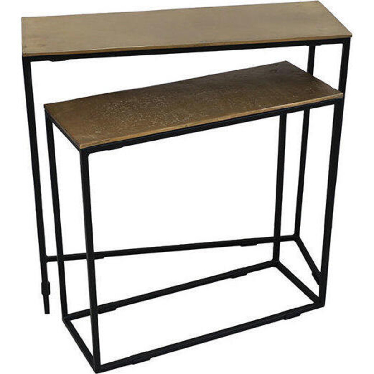 Space utilization has great deal to do with how well we can display our articles be it for use or display and consoles do play a vital role in allowing this luxury. This set has been crafted from metal and aluminum, known to be lightweight yet sturdy and durable. The table top has a lovely dull copper sheen while the legs, though simple add a touch of dark contrast. Would look great at the entryway of homes where you may try it for displaying pictures, keeping knic knacks or simply using it in the outdoors for your latest displays, laying out food and any sort of use that ends table top spaces. The taller of the two is 52 cm in height while the shorter one is 42 cm in height. The larger table is about 66 cm in length making it handsomely large space for utility while the smaller of the two is 56 cm in length. A simple yet very useful set of strong metal furniture to give your spaces their well-deserved display option.