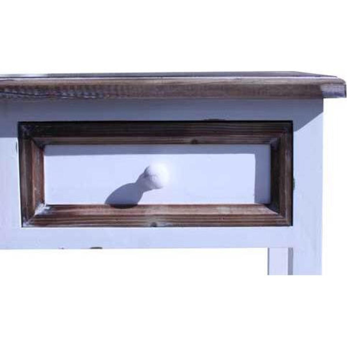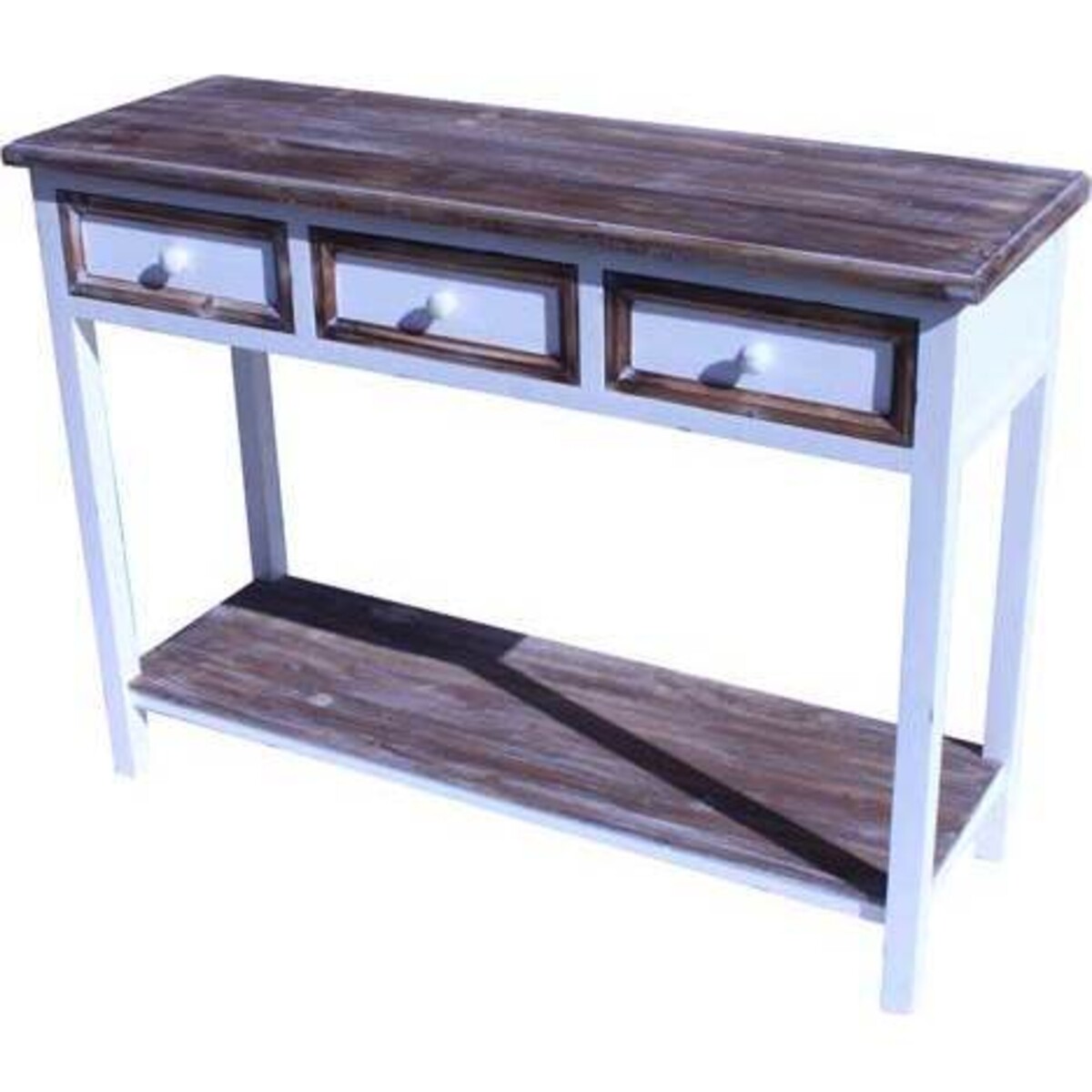 This console table in two coloured tones has an antique look with peeling paint and wood seasoning done to perfection to create this look. The colour is neutral enough to help it blend in with other pieces of furniture. The dimensions are most suitable for home interiors that need tiny storage or shelving facility as the table comes with two surfaces for display and a set of three drawers with neat enamel knobs. An ideal choice for keeping decorative knick knacks, books and lamps to do up a corner with its old world vintage charm. The dimensions are suitable enough to fit in with small and large spaces with equal ease. Sturdy, well seasoned wood with a range of grains on the surface makes it all the more charming. A useful piece of furniture that will serve its utility and yet add much to the look of the interiors.