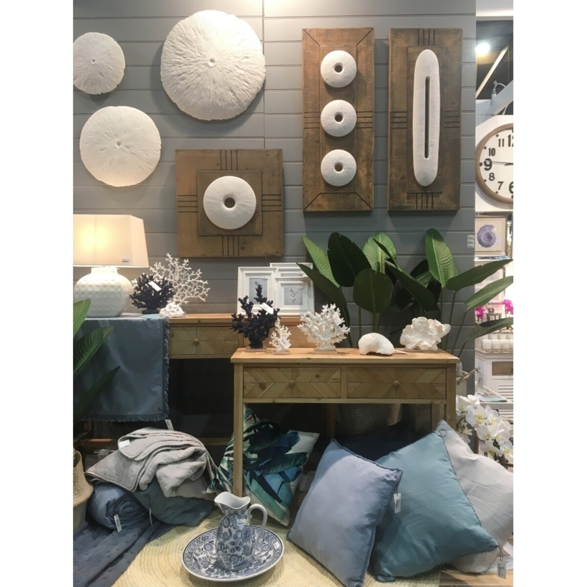 Your coastal home can get a brand-new character if only you can imaginatively use the superb combination of wood and coral that Lavida brings to you. Made to add the tonal beauty of coral ivory colour and its textured fine design with the textures that natural timber possesses-this is a happy communion of two completely varying mediums, yet they come together with such perfectness of purpose and blend in beautifully as nature deemed it to. This plaque showcases a panel like proportion with a longish oval disc of coral right in the middle gracing the length of the panel. You could use this to create an abstract kind of presentation on the wall with another such wooden board or simply use it laterally above the side board or the console and light it up from below-adding more beauty to its colour and unique kind of form. An imaginative and creative usage of textures, colours and form for your truly coastal feel home. The plaque is 100 cm long and 40 cm wide.