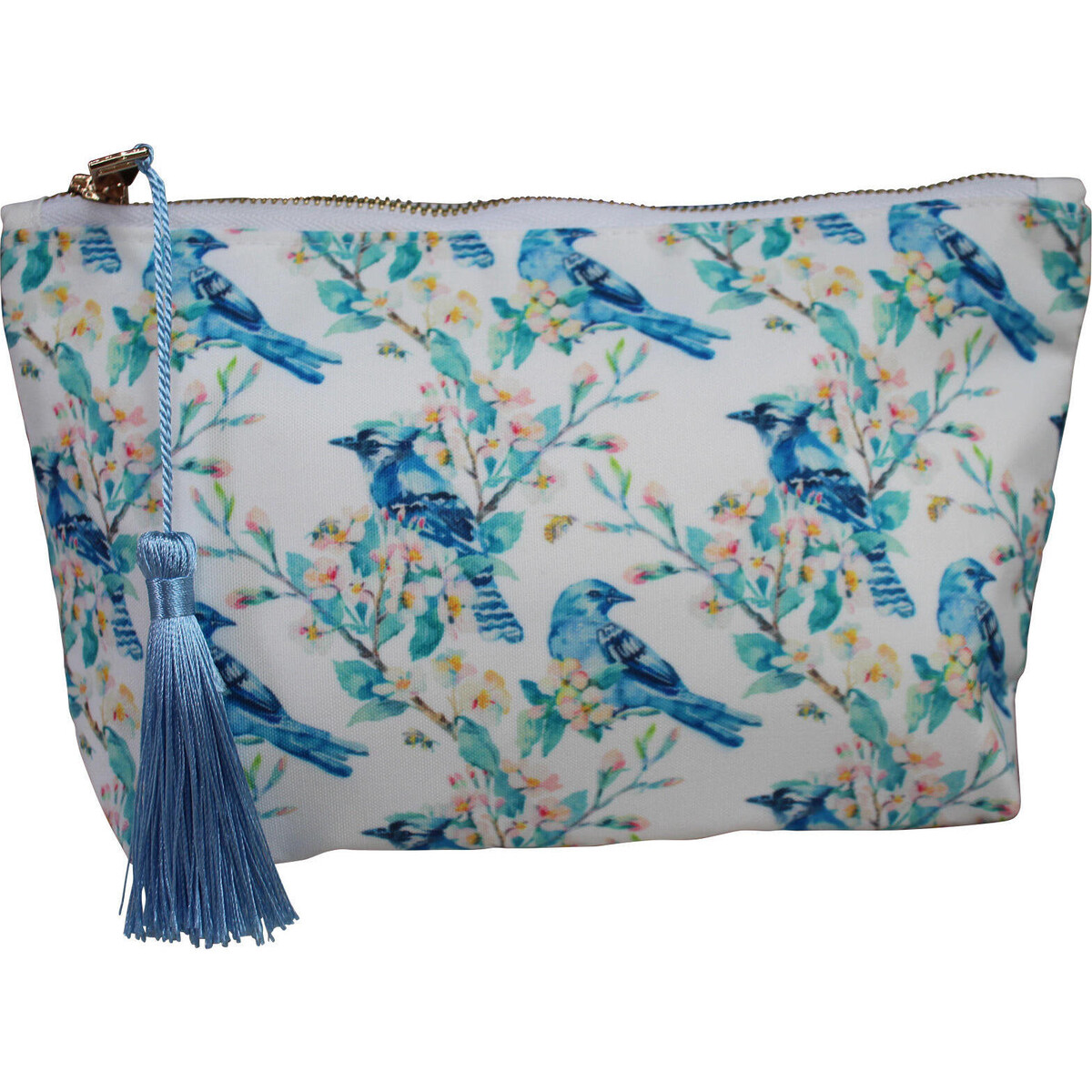 Give your tiny possessions the advantage of a pouch that is embellished with a lovely tassel hanging from the side, coordinating fabulous with the print all over the exterior. Made from washable polyester fabric that feels smooth on touching, the white backdrop is adorned with a blue print showing off tiny kingfishers sitting on branches with blooms. The play of soothing colours and the very fact that it's a handy little zippered bag that can hold most of your tiny possessions makes it an attractive accessory of your own. The zipper is easy flow and the It has spacious interiors, just the right kind, to hold a great many things with ease. Place this in your hobo or let it grace the top of your vanity see the manner in which its beautiful colours will make things loo far more organized. Be it your tiny box of pills or your lush lip colour-the set of keys to your front door or the hurriedly placed stash of currency, there is space for all.