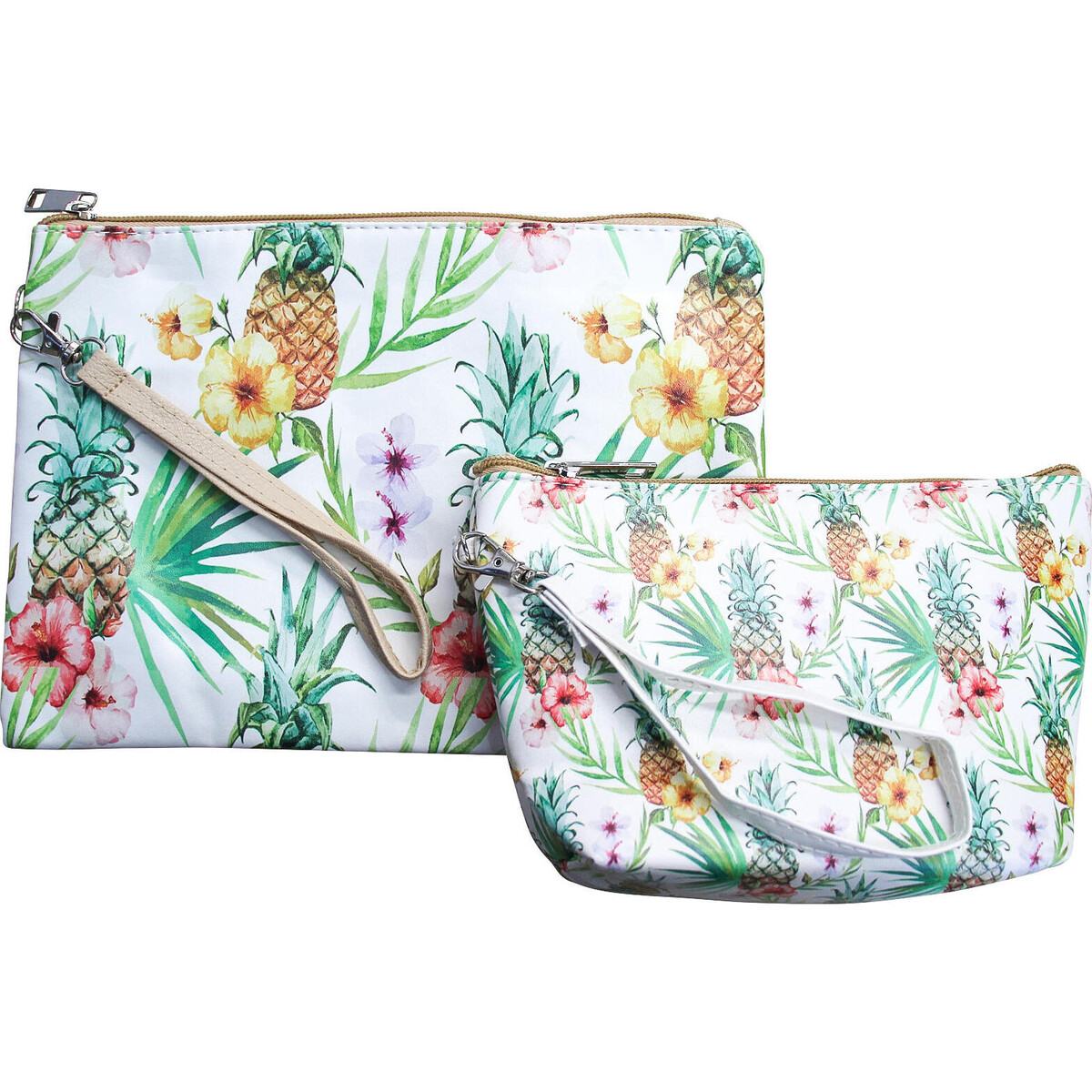 Made from plastic and polyester this tropical print bag has two pieces in the set. A smaller pouch that can reside in the larger one eases the trouble of looking for small possessions like coins or trinkets while the larger one can be the one holding all other things, made from sturdy material. Zippered for ease of reopening. It will be a great means to accessorize and help make your larger bag hold thing sin better more organized way. the pouch is sized for convenience at 25 cm of length and 18 cm of height. The delightful white coloured backdrop throws into relief the print that shows off its colours ever to delightfully. The loop handle and the coordinated pink coloured zippers add to their appeal. Easy to grip from top or simply swing from your wrist. They will be a great means to carry small possessions in better more organized way or help keep your everyday use items well within reach.