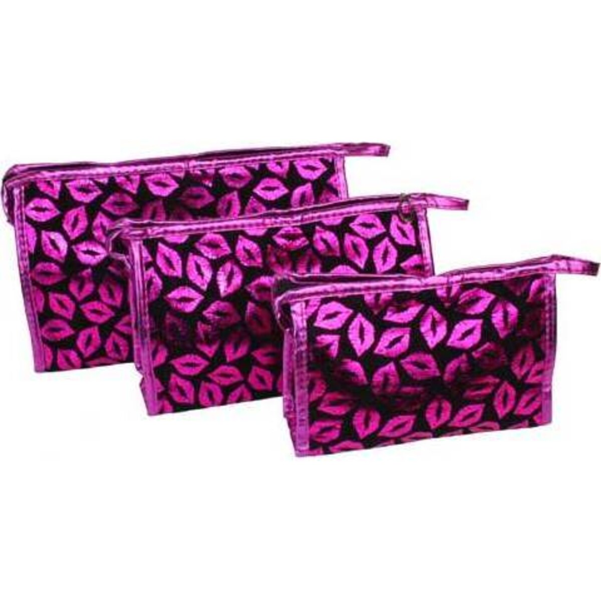 Cosmetics Bag Pink Lips S/3 features a set of three rectangular bags of variable size, with the largest one measuring 27x16x5 cm. They comprise of pink prints on black background, with the entire presentation being done on a soft fabric. Any of the three pieces would be delightful to carry when venturing outdoors. Ladies can pack in the exact volume of beauty products necessary for a particular occasion. This ensures they keep looking attractive at all times. This set of cosmetic products offers a great bargain for the urbane woman at any rate.