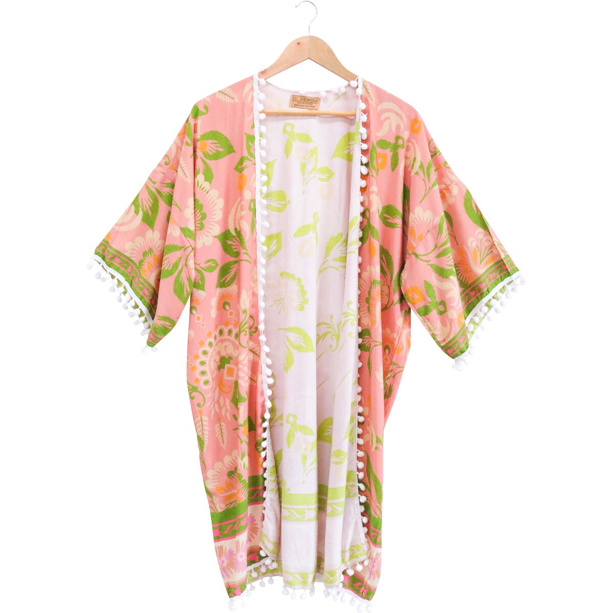 We can't help but feel that our Cover-Up Seychelles is a real stunner. It's crafted from imitation silk (polyester), it's got that soft, slightly shimmery finish that customers tend to be drawn to - and it feels lovely on the skin. The print alone makes it a standout piece. It's full of fresh blooms, warm green foliage, and these gentle oranges and pinks that just sort of melt into each other. But what really grabbed our attention was the little details. That lightweight white piping runs all the way down to the hem, and those tiny pom-poms lining the sleeves and bottom edge add just enough quirky charm without going overboard - which is great if your customers lean more towards subtle. At approximately 100cm long, it's the perfect size for lots of people - especially since we've cut it as a generous one-size-fits-most. We've seen this look great over bathers by the pool or at the beach, but we've also heard from people who'd wear it to brunch with some strappy sandals or even a pair of jeans. Something about it makes us want to put our feet up with a book under a palm tree - but that's not always possible if you're in Melbourne. We like that you can stock this for different customers - if they're after something to throw on for resort-wear or they've got more casual plans at home, this one's versatile enough.