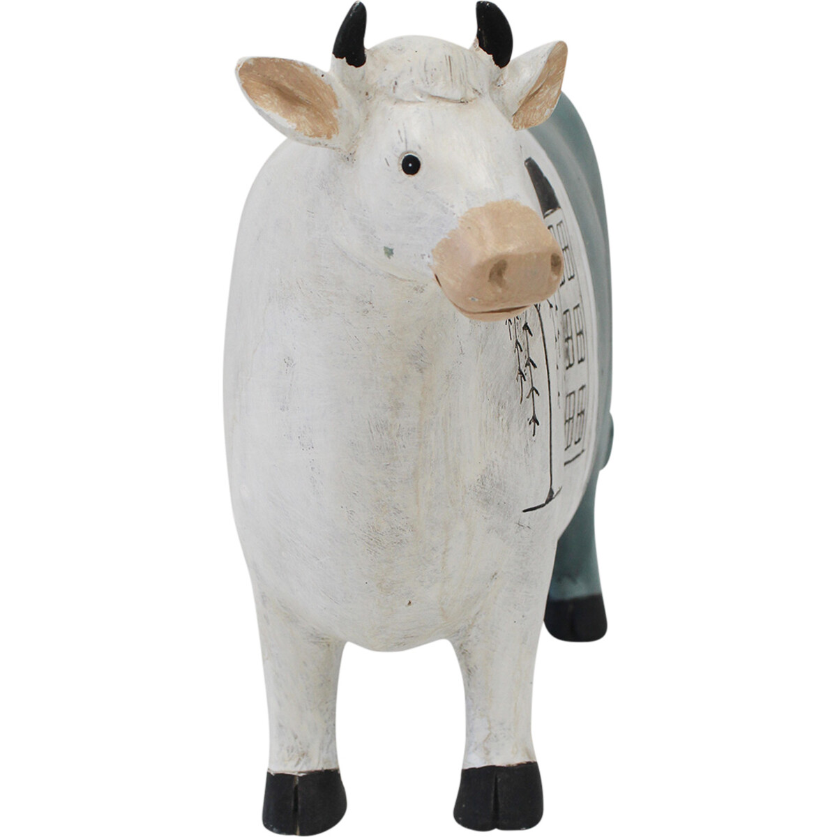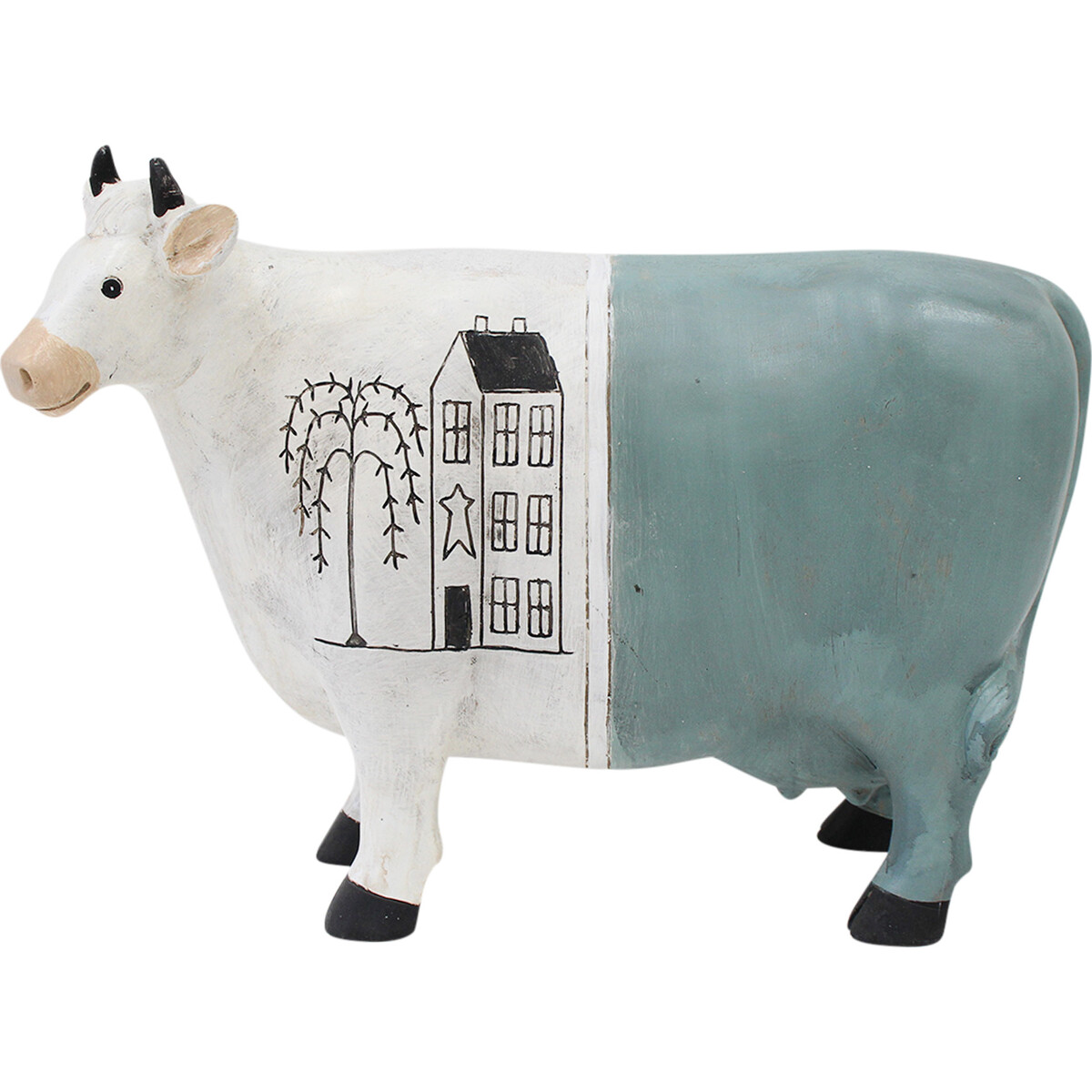 Did you know that cows have the peculiar characteristics of being able to sleep soundly even while standing on all fours? This popular source of beef is artfully moulded and depicted in this figurine plus an added aesthetic touch. The 29 centimetres long figurine showcases the image of a fattened cow possessive of two properly demarcated colours starting from the cow's middles. On the side of the cow is the image of a cottage and a tree beside it. All four hooves plus the horn are painted in black while the nose, mouth and inner part of the ears is a creamy colour.