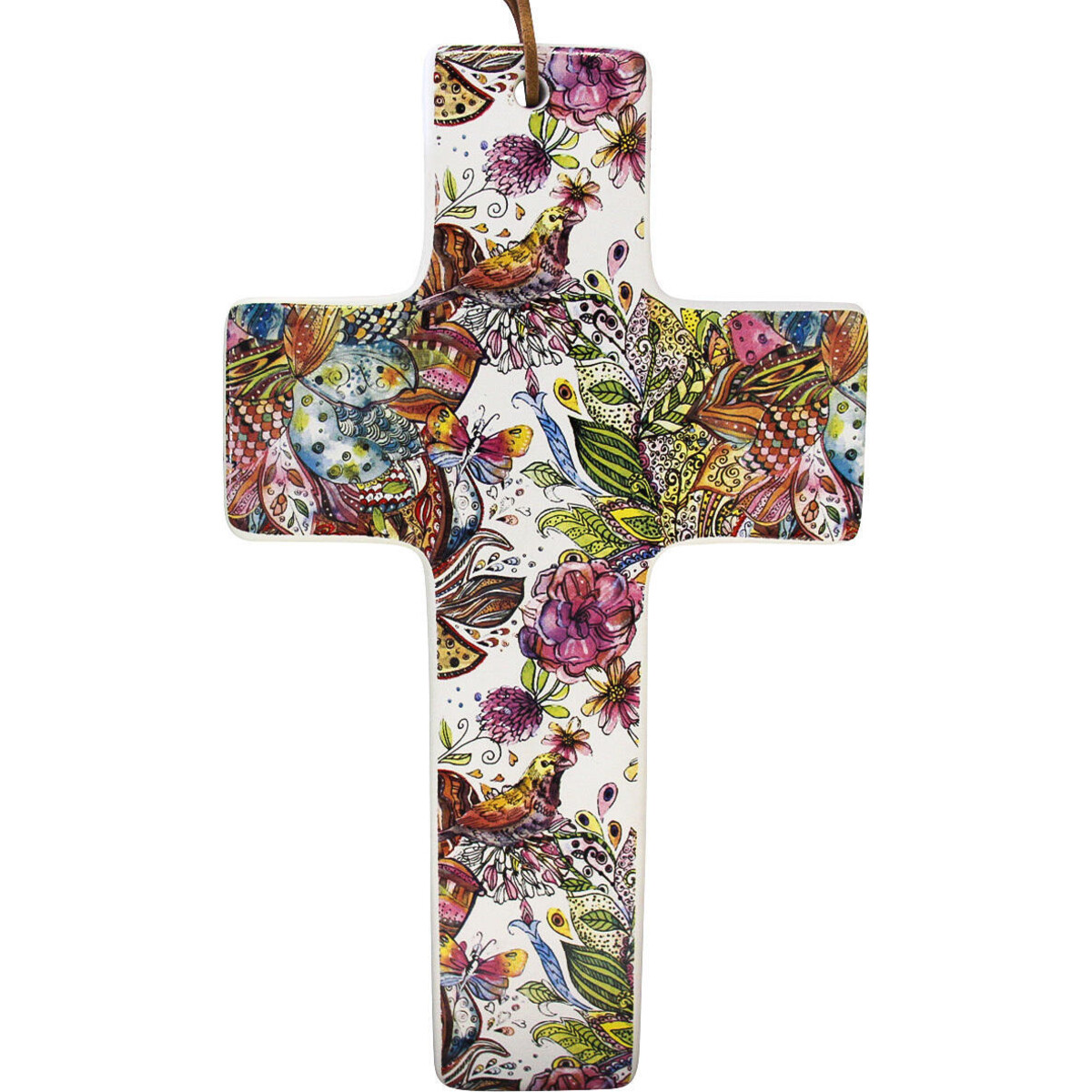 Perfect for decorative use in living rooms, dining rooms, kitchens, bedrooms, guest rooms, porch, and even rest rooms, the Hanging Cross Large Boho Paisley is truly a large ceramic hanging cross ornament which has a dimension measuring 23 centimetres in height and 14 centimetres in length. Each ceramic Boho hanging cross comes with a string with which your customers would find it easy and convenient in hanging it on walls, mantelpiece, furniture, Christmas trees, rear view mirrors of cars, etc. Glazed on the glossy body in bright colours such as purple, green, and brown are the images of birds, exotic plants and butterflies.