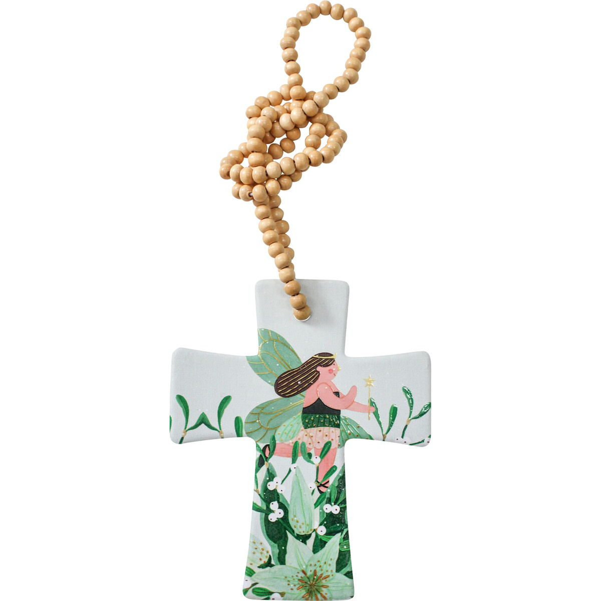 The Cross Fairy measures 12x14x.05cm with the beads included. It comes in a beautiful pink, green, and white shade and is made from high-quality ceramic and wood materials.