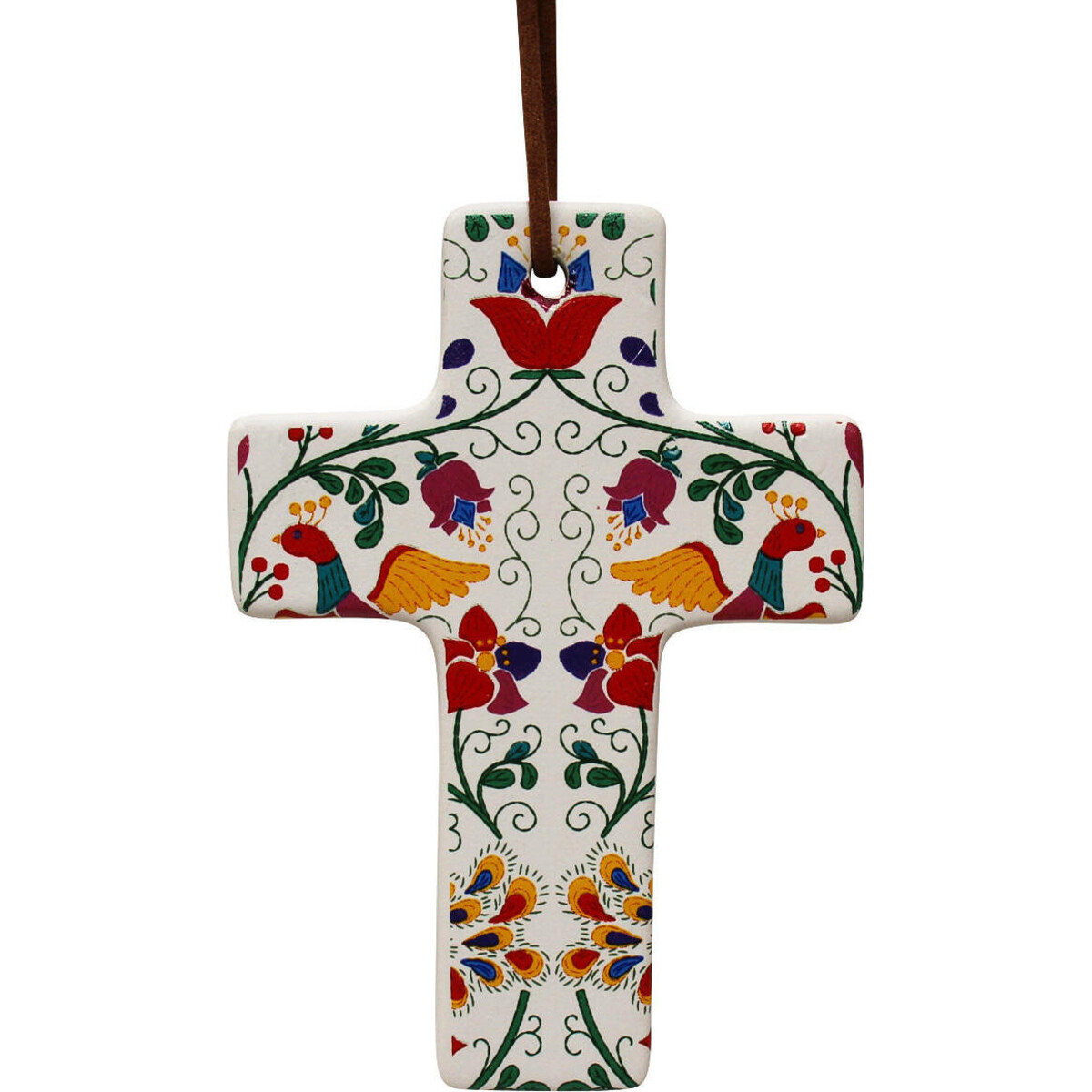 The Hanging Cross Folk is highly functional as a decorative ornament as well as a symbolic item of worship. Churches, homes, offices, shops, and other places where people, especially Christians live, worship and/or work would find this ceramic cross to be hugely attractive. This is because on the smooth white surface is glazed the colourful images of birds and ornamental plants which gives this ceramic cross its classic decorative appearance. It would be perfect for decorating special occasions like Christmas in which with the aid of the string provided, customers can have it hanged on Christmas trees, living room and dining room walls, furniture, mantelpiece, etc.