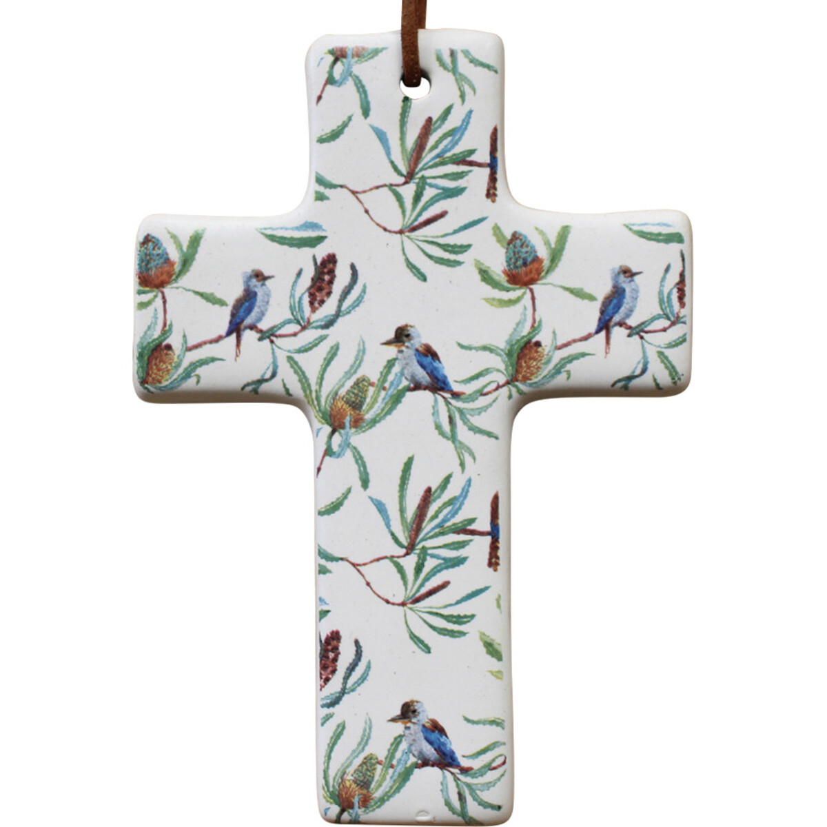Made from fine quality ceramic, this cross has been lovingly handcrafted following traditional methods that make ceramic articles such a delight. Coming a sit des with the trademark handcrafting, it has its tiny imperfections lending it a great personality. The smooth white backdrop is the perfect foil for the print of small kookaburras that makes it look so attractive and full of cheeriness. You could hang it from any place of your choice with the help of the tiny little string looped from the top. Will make a great giveaway for Baptism and Christianising ceremonies. A lovely gift for anyone who likes to keep his or her faith close by her side. The size too makes it rather attractively compact at 12 cm in height and 8 cm in width.