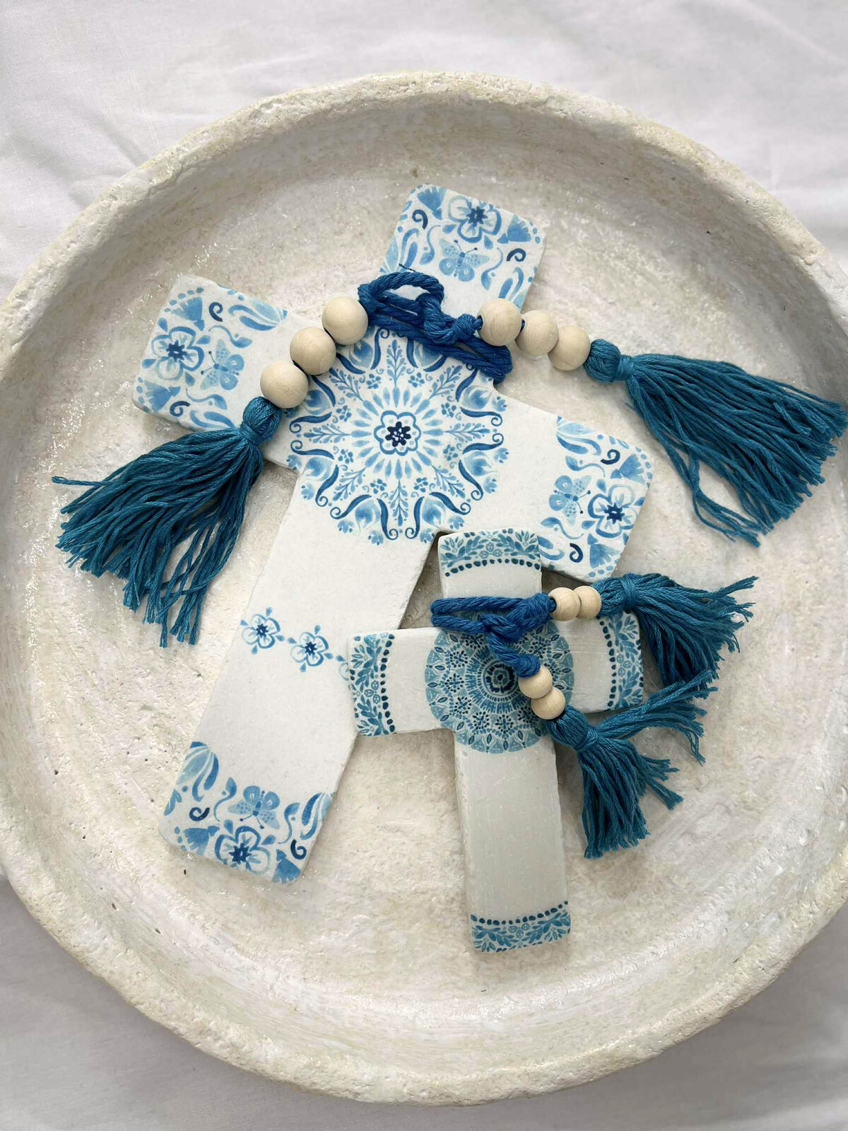 We know your customers love pieces that feel a bit special - something they’d be proud to put on display or give as a thoughtful present. This Cross Lrg Mandala Poetry Blue really delivers on that front. It’s crafted from resin, measuring 16x22x16.5cm, and we have to say, the mandala detailing in blue is just beautiful. It manages to look both modern and classic at the same time. We love how the soft blue, the wood beads, and those long tassels all tie together - makes it feel a little more creative than a standard cross.