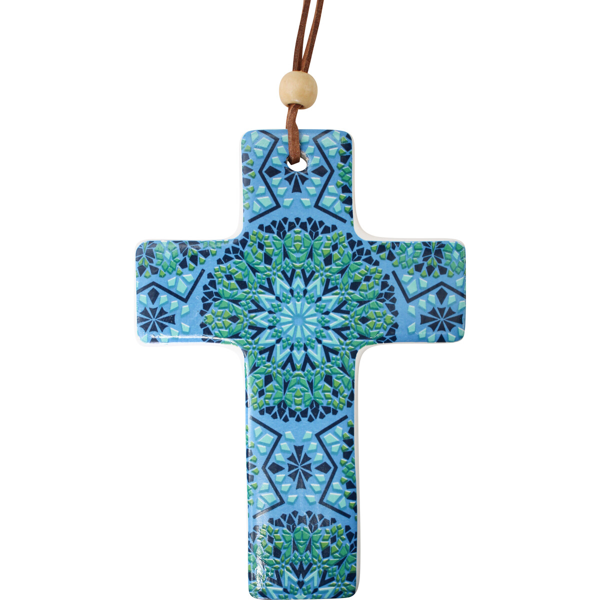 The Cross here features a delightful combination of traditional mosaic style artwork on its visage. The soft and deep blue hues combine gorgeously to create delightful colour impact. It’s dainty and yet impactful enough to make an impression when placed on the wall or simply if out up on the shelf. Crosses bring with them the joy and beauty of traditional symbol that connects spiritually with our inner self-helping us wind down the stresses and submit to a calmer and saner sensibilities of belief. Would be a great communion gift or a nice give away after baptism or Christmas and Easter. Fits as much on the wall as it will in bag and can be your easy to carry along spiritual symbol. The smooth ceramic body speaks of a fine well finished crafting technique. The twine slotted on top makes it easy to hang and place.