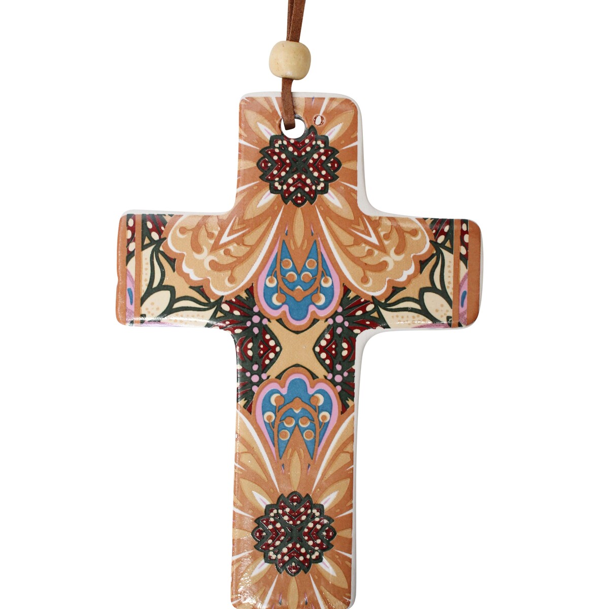 Made from ceramic the fold inspired Cross combines a burst if deep colours against paler backdrop that brings alive the traditional folk art on its visage. While it makes a great choice during festive time decorations -perhaps even up in the tree during Christmas, it would also make a great gift for Christening ceremony or during any other get to- gathers like birthdays and remembrances. Will add a wonderful appeal to your prayer nook. It’s a dainty little piece with its smooth ceramic finish that feel cool and assuring when held in hand. It features traditional folk design with a pop of turquoise and deep forest green that work wonderfully with taupe and white. About 12 cm height and 8.5 cm in width its bound to help bring in a relaxed and calm mood to any space where it is placed.