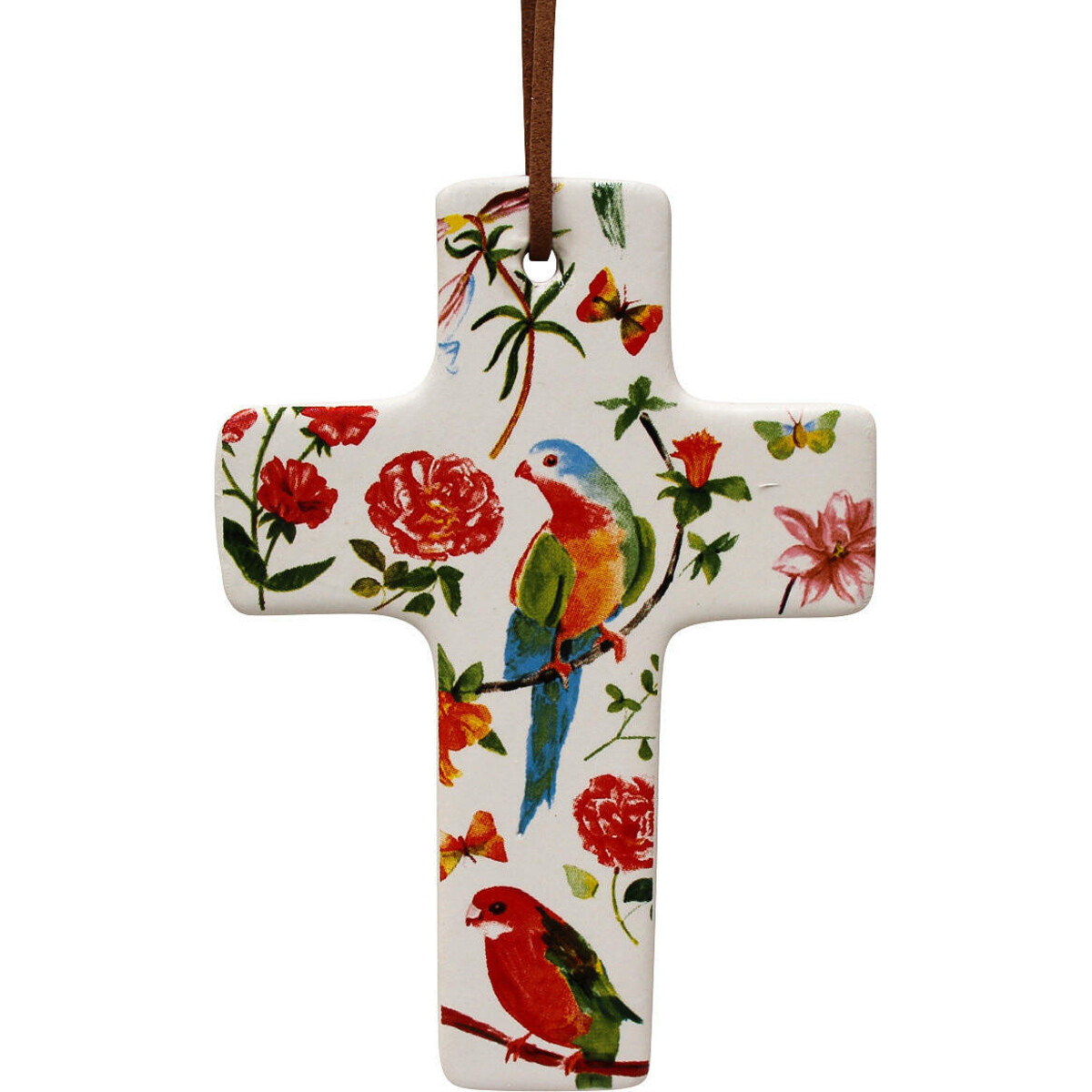 Let this cross bless someone's home or office in style, or give some new colourful tones to an indoor or outdoor atmosphere. A thin, lightweight, ribbon strings through the small hole of each cross, enabling people to hang it anywhere they like. Its lightweight design can be easily hung with a wall hook for easy and instant installation in any space. This Hanging Cross Parrot works wonderfully both as a gift item and as a year-round decoration for a wall, mantlepiece, and doorknob. Even lay it flat on a dining table as a centrepiece for entertaining!