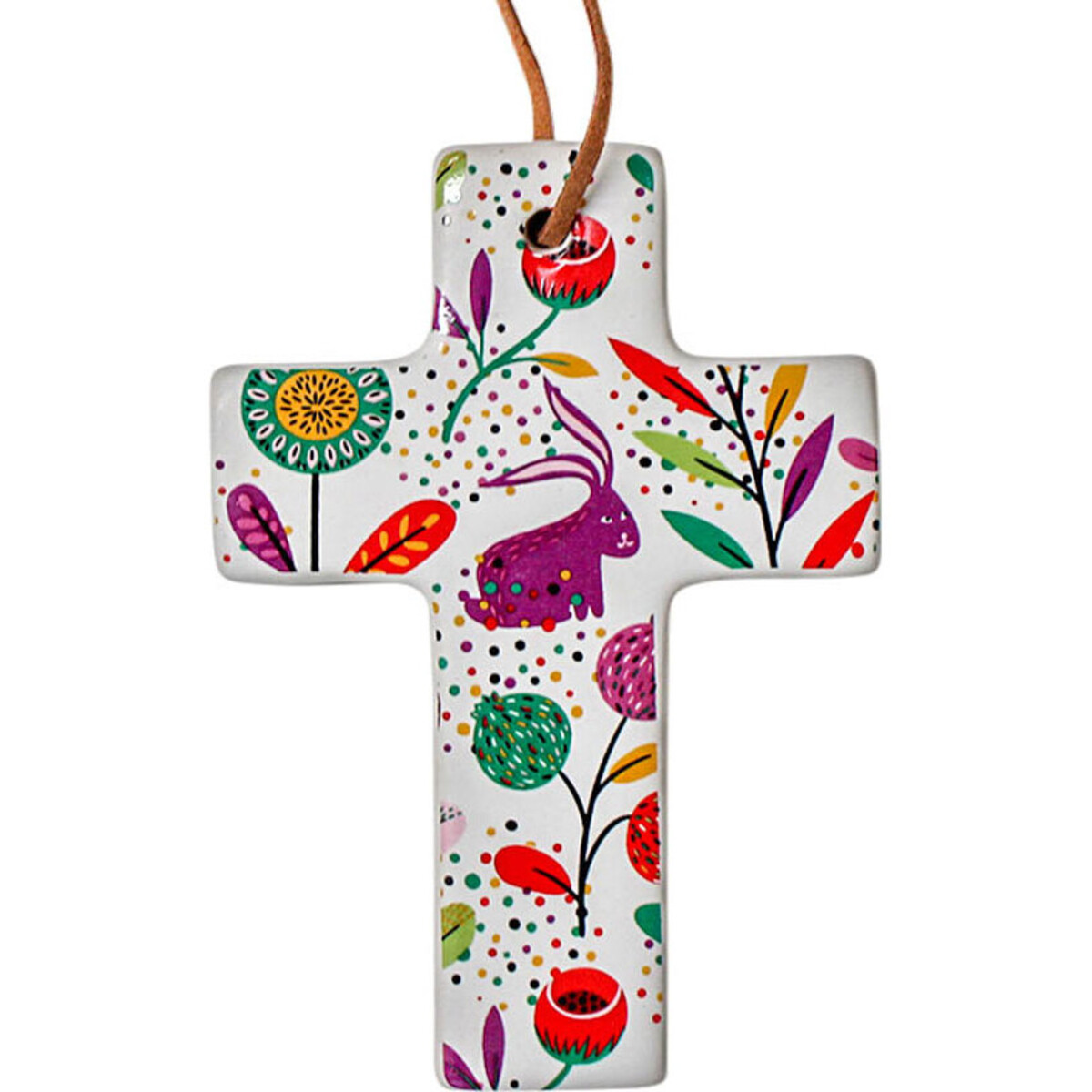 The ceramic cross features a perfect blend of vintage and classic accent. Cross Vintage Rabbit has a charming finish that adds a splash of colour to any room. This piece comes with a hole at the top and a hanging ribbon accessory. It can also be tweaked according to the client's preference. Replace the ribbon with a jute twine from a classic to a more traditional accent. With a low maintenance feature, wear and tear reliability, this piece makes the best wall hanging statement. The vintage rabbit design is auspicious and comes in handy during the christening, birthday or special occasion. It makes an eye-catching centrepiece on Christmas trees.
