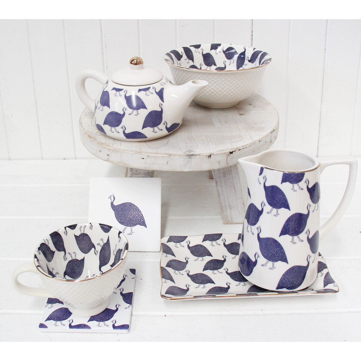 By integrating geometric patterns and a colourful gradient technique, the enriched dark blue gives a striking contrast of the green and white showcasing an artistic and beautiful design. Each set consists of two cups with a beautiful design on the outside and the beautiful Guinea Fowl design inside. The plates are made of premium, high-quality food-grade porcelain for strength and durability. Porcelain is also the most prized material for teacups as it's non-porous, holds the temperature very well and is easy to clean. A fantastic gift for your mom and dad, grandparents, colleagues, and perfect for the guests at your house, this beautiful and artistic design of the Guinea Fowl look visually appealing and is an excellent way to welcome your guests into your housewarming ceremonies and dinner parties.