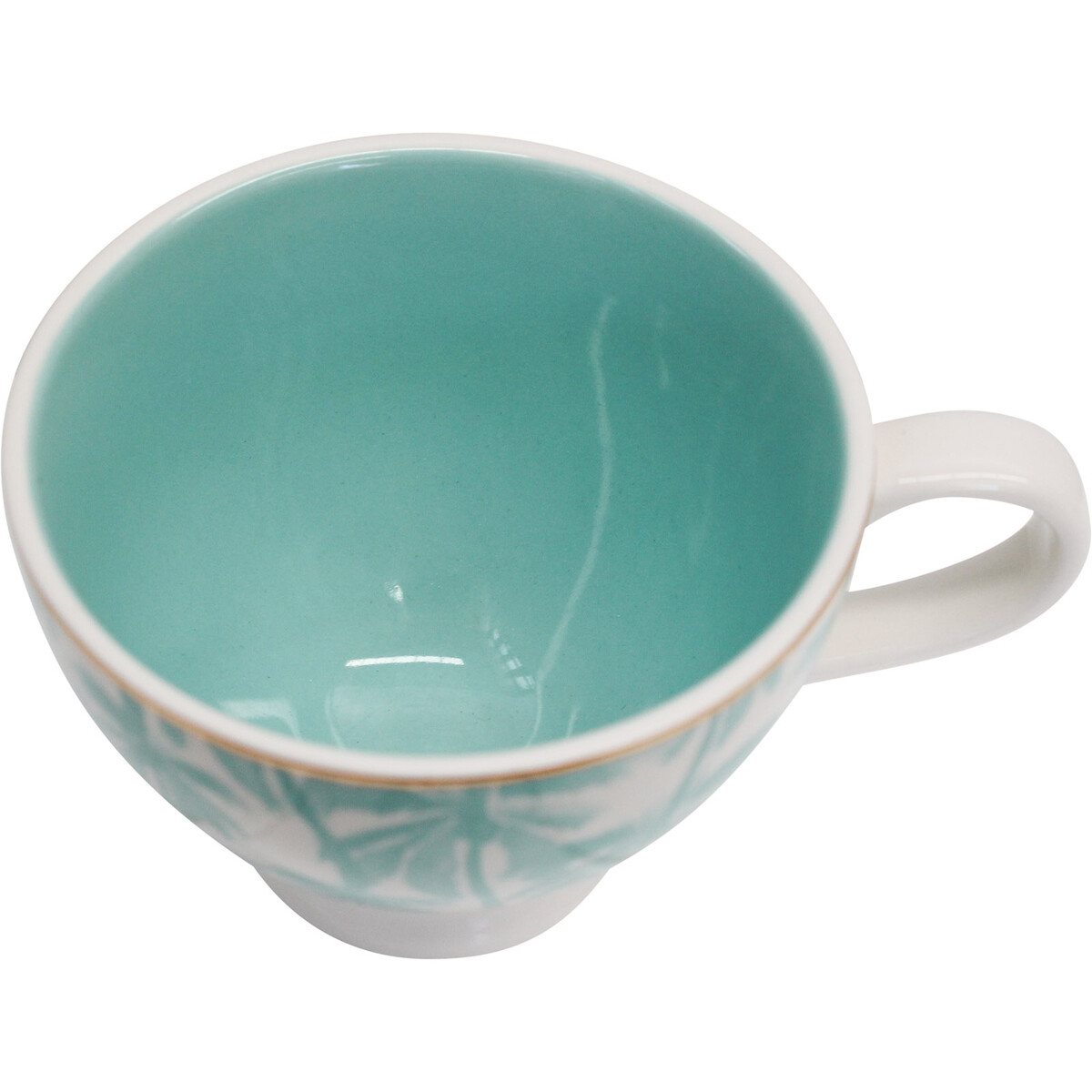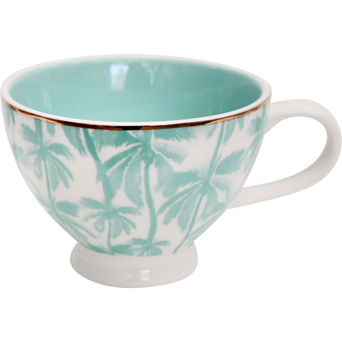 Showcasing an immensely pretty porcelain cup that is artfully moulded in a compact size, it is made in a dimension that measures 13.5 centimetres in length, 10.5 centimetres in width, and stands on a beautiful decal placement that gives it a total height of 7.5 centimetres. While the glossy, smooth textured interior is hued in an alluring shade, the exterior of this cup has a decorative flourish made possible by its artful palm motif.