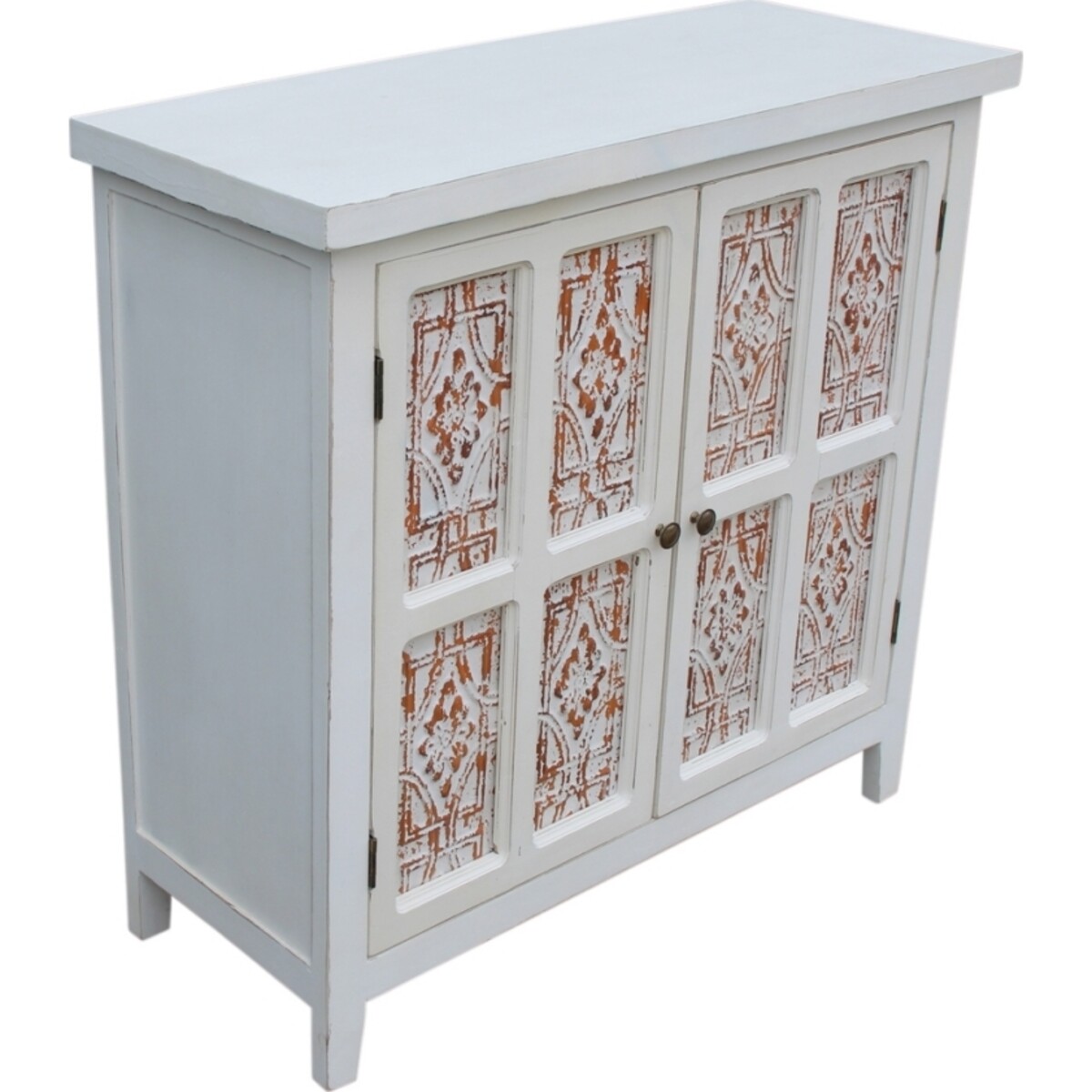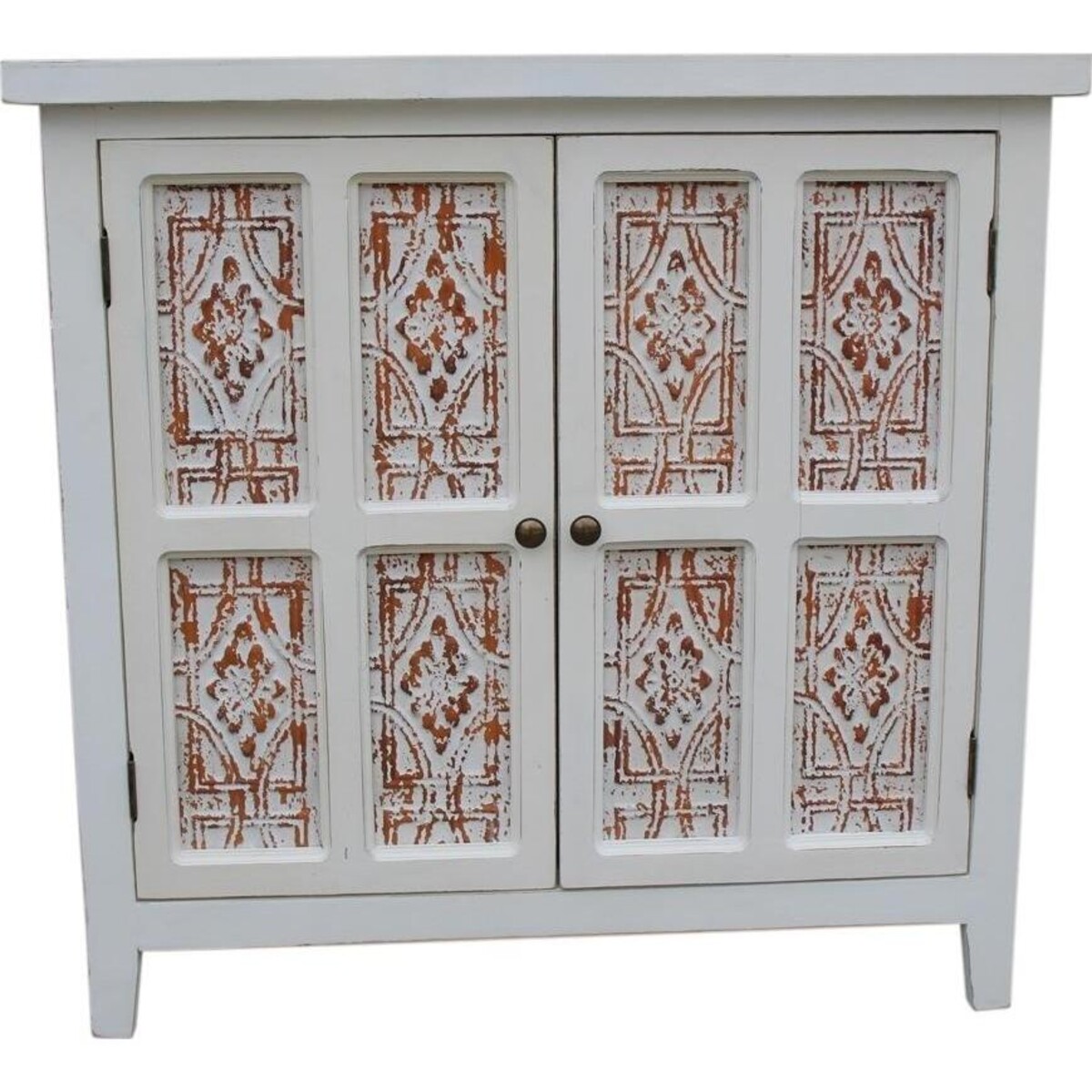 A home is all about creating the right kind of storage spaces in the best possible way so as not to take up too much floor or wall space and this cabinet fits the bill perfectly. Tiny, with a height of a mere 84 cm it has double doors that open up to reveal shelves. The doors are patterned that makes its look all the more attractive. The white painted exterior gets more enhanced with the antique look pattern on the doors in rusty brown colour. Easy to open with the help pf sturdy knobs. Will suit your usage needs in the washroom, dressing area or the kitchen with as much style. The table top space too turns into somewhat like any other display are where you could place décor or utility articles. The length of the cabinet is all of 86 cm and its depth is 35 cm making the top quite a large display shelf for usage. Multifarious usage makes this a great buy for those who like to keep their décor stylishly simple and yet modern and chic.