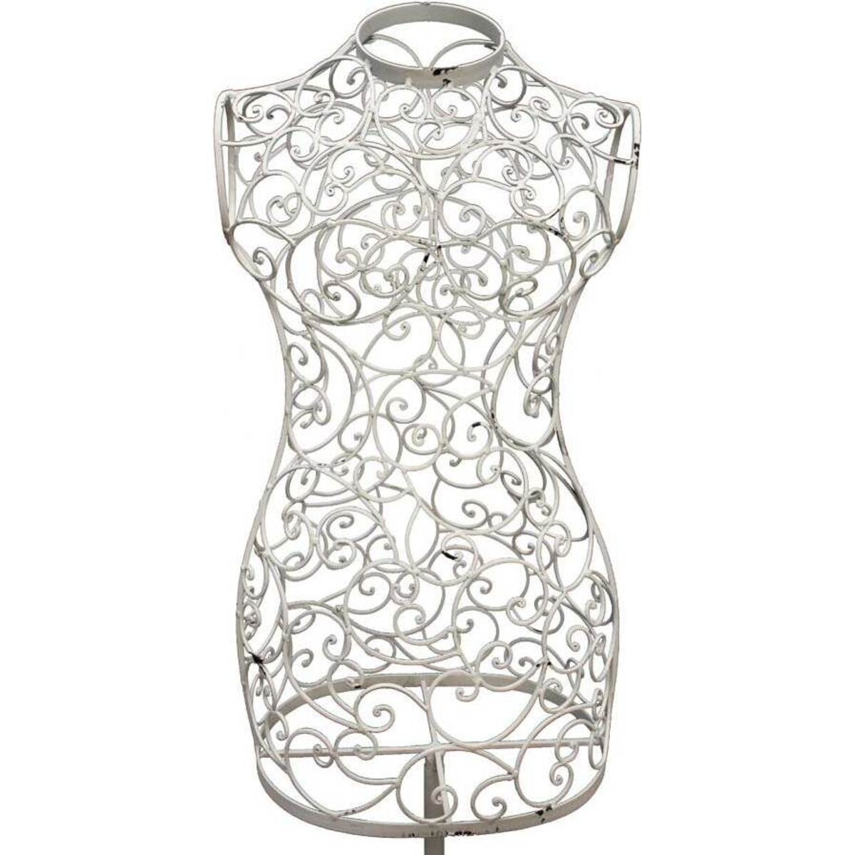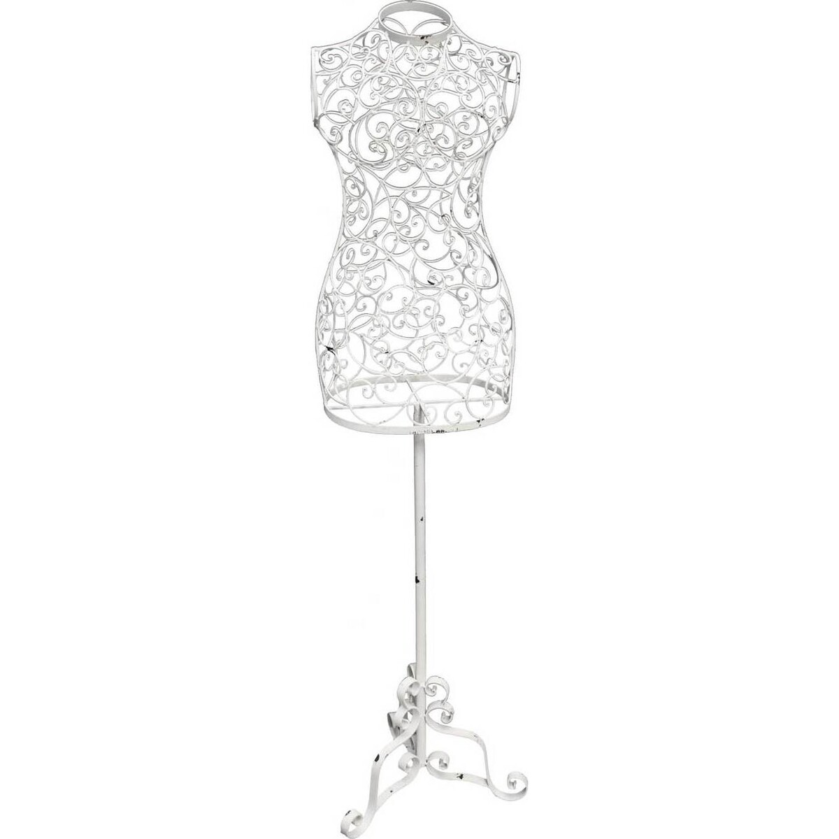 This Rustic White Curlz Model from Lavida consists of a white metal torso shape that's made up of a series of intricate swirls and designs. It sits on a white metal stand that has a base which features three feet to ensure there's no tipping and minimal sliding. These models are ideal for anyone who loves fashion, and they can be displayed and used anywhere from retail stores to schools to in bedrooms for those who want to lay out the next day's wardrobe in a unique way. Their white colouring allows them to complement any colour scheme, and their design can easily fit in a variety of environments.