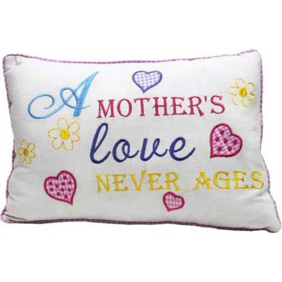 • The words "A Mother's Love Never Ages" appear in varying fonts done in a satin embroidery stitch in baby blue, red, navy blue, and sunny yellow.