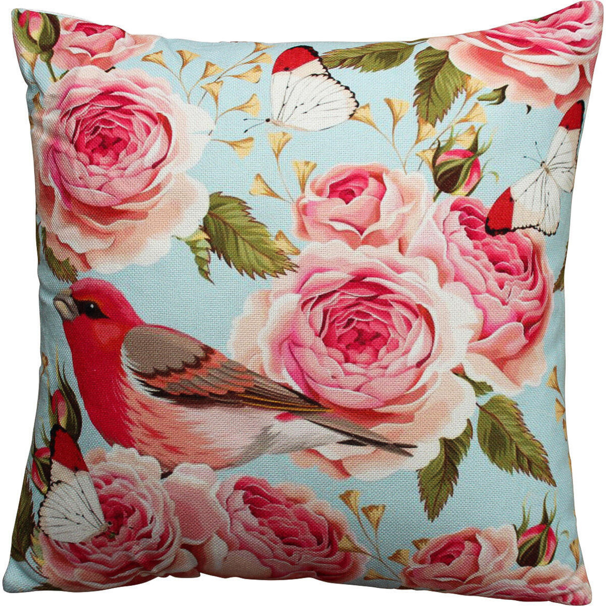 Give your home and seating spaces touch of sprig luxury with this simple yet artful inclusion in the form of a throw cushion that is filled with the colours of Springtime, made of polyester linen, the pale blue backdrop throws into relief the burgeoning beauty of ink roses in all possible deeper and lighter oink hues, the bird I one corner adds to its very graceful and charming kind of effect on the spaces around. Add solid coloured cushions in whites pale blues ad green and help highlight the beauty of this print, the square cushion with its myriad colours will help infuse your spaces with one of a kind resplendence that textures and colours will endow your spaces with. As great for your bedroom as for the outdoor seating by the patio or the living room couch.