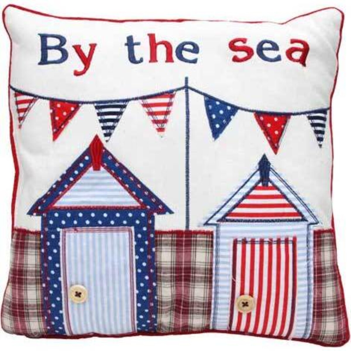 é The square pillow is stuffed and then trimmed with red cord piping. é An optic white background fabric is the setting for two beach cabanas or changing rooms. One is done in navy blue with white polka dots and has a light blue and white striped door and roof inset. The other is blue and white stripes with a red and white striped door and roof inset. é Wooden button doorknobs and contrast stitching that trims the appliqués give the pillow a hand crafted look. é A banner of nautical flags in red, white, and blue dots and stripes hangs above, and a red plaid "ground" sets off the rest of the design.
