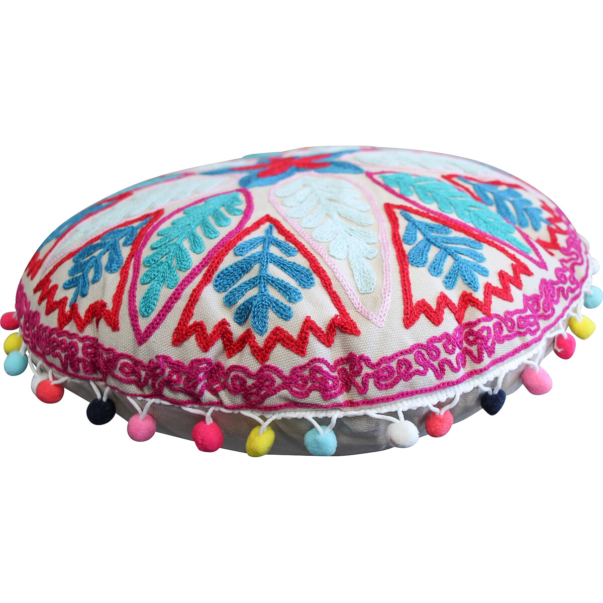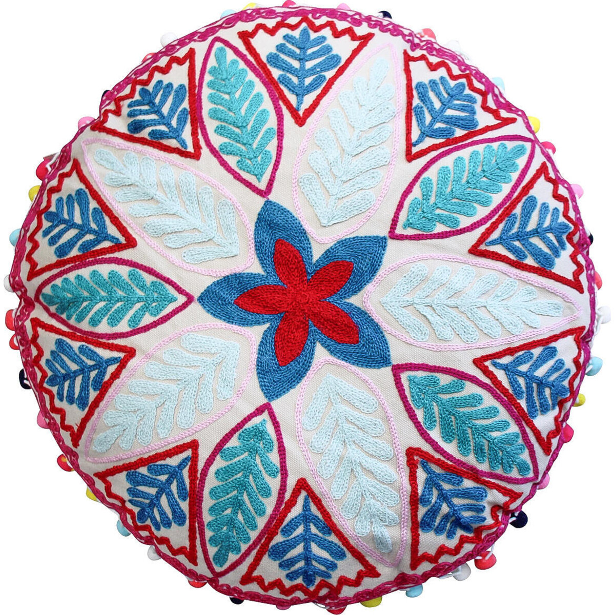 After all, for making your seating spaces as comfortable as it can eb you need to add a lush comfortable look to them and what better then cushions to help you do that. Here is one that ash been designed for relaxed comfort and also for adding a zestful colourful kind of cheery look. Made from polyester, the shape is round which adds to its uniqueness as well. The white central pattern is surrounded by outer design in red and blue-the striking contrast these colours adds that bohemian chicness to your space. the chain stitch embroidery will not fray and the colours will be as lively even after long usage. The size and shape will sit perfectly as much on couches and loungers as on chairs and on the divan or your bed. Will combine with white or deeper coloured cushions. Draw attention to its details by adding some single coloured cushions with this one.