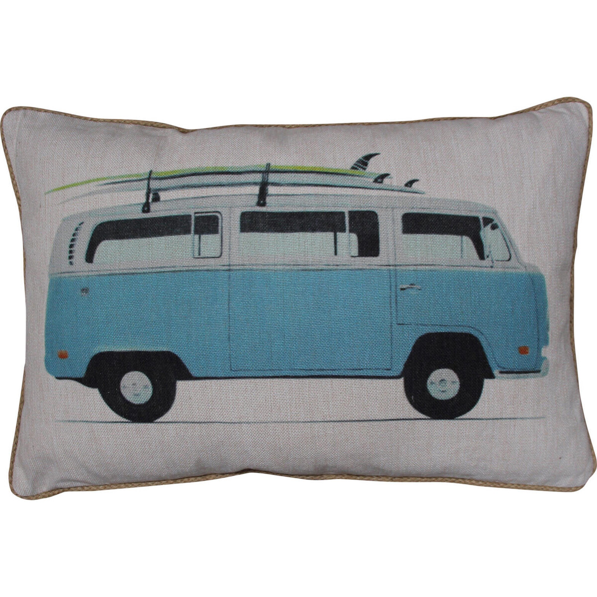 Adding cushions will always bring the feeling of comfort and utter relaxation to your space-after all that is what pushing up and adding more supreme comfort is all about. Here is a superbly created cushion whose rectangular shape is adorned with a very fine kind of print that echoes the mood of the beach and the holiday season. Come summer and your home needs to portray the freshness and the energy of the sunny seaside- and what better means to introduce that in your interiors but through this wonderfully conceived cushion made from canvas polyester and filled with the plushest of poly fill, you would be able to bring in that style and season update, the fresh blue and white colours instantly change the mood to a soothing one and adds a touch of instant relaxation. The van printed on the face of the cushion creates the associations of holiday season-beachside memories and days of abandonment. A wonderful way to give your bedroom. Den or the living room an informal and supremely comfortable feel.