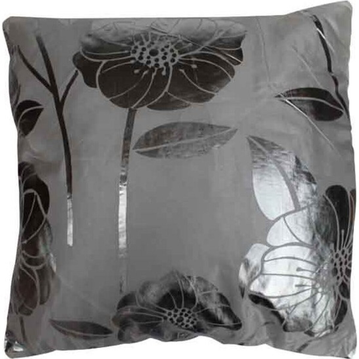Covering the form of the pillow is a smooth and silky gray fabric that is comfortable to the touch. Adorning this gray fabric is a pattern of flowers that comes in shiny metallic silver. As to the shape, it takes the conventional square form and is simple in its design.