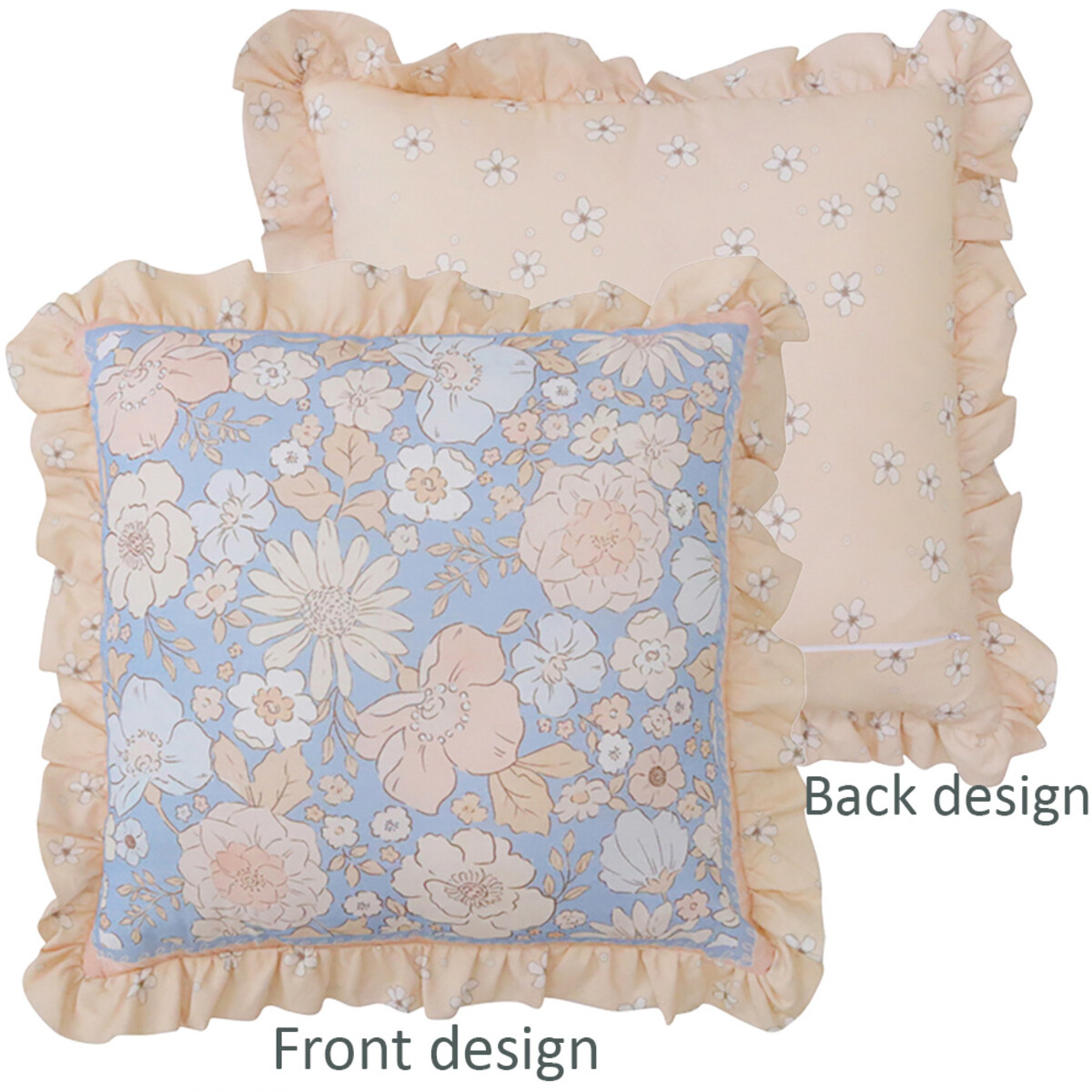 Both sides bring something to the table; you get these large, pink daisies on one side and dainty white florals against a beige background on the other side. And we really have to mention those oversized peach ruffles that go all around it, giving an already-cosy cushion even more character.