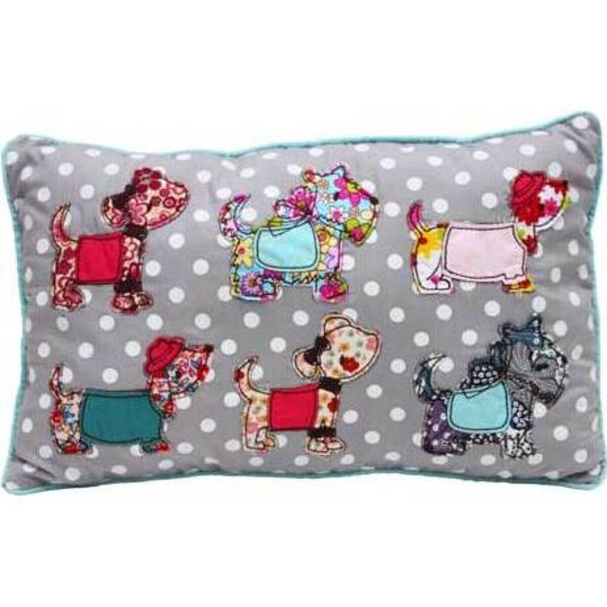• The rectangular shaped pillow is done in a beautiful medium grey in polyester cotton with a soft sheen. It's generously stuffed and then finished around the edges with baby blue cord trim or piping. • Six calico dogs adorn the front, all facing the same direction as though awaiting their instructions to begin the parade. • Each dog is done in a different print, each has his own coat or blanket, and some wear hats while the others wear bows. • The dogs and their clothing are topstitched all around, giving this pillow the appearance of a hand crafted item. If you're looking to round out your inventory, have a look at all our whimsical pillows and use them across the store in children's, gifts, and home goods.